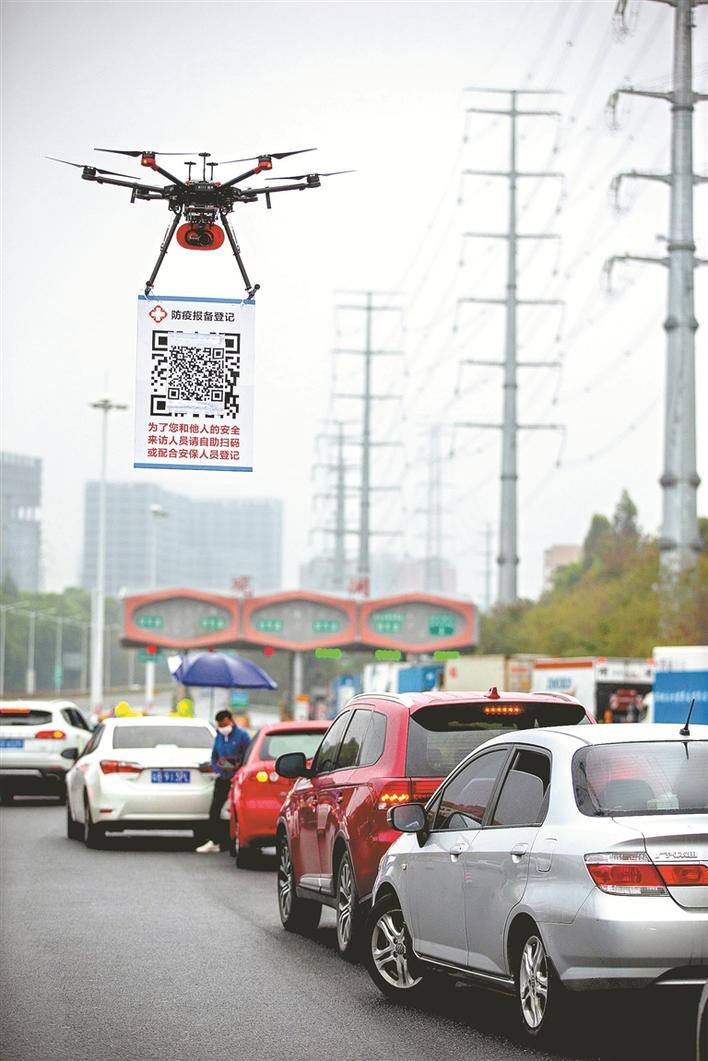 2月11日,在G94高速深圳觀瀾收費(fèi)處,深圳龍華機(jī)訓(xùn)大隊無人機(jī)飛行隊的民警操作懸掛有申報二維碼的無人機(jī)在候檢的車輛間飛行。晶報記者賴?yán)鐢z