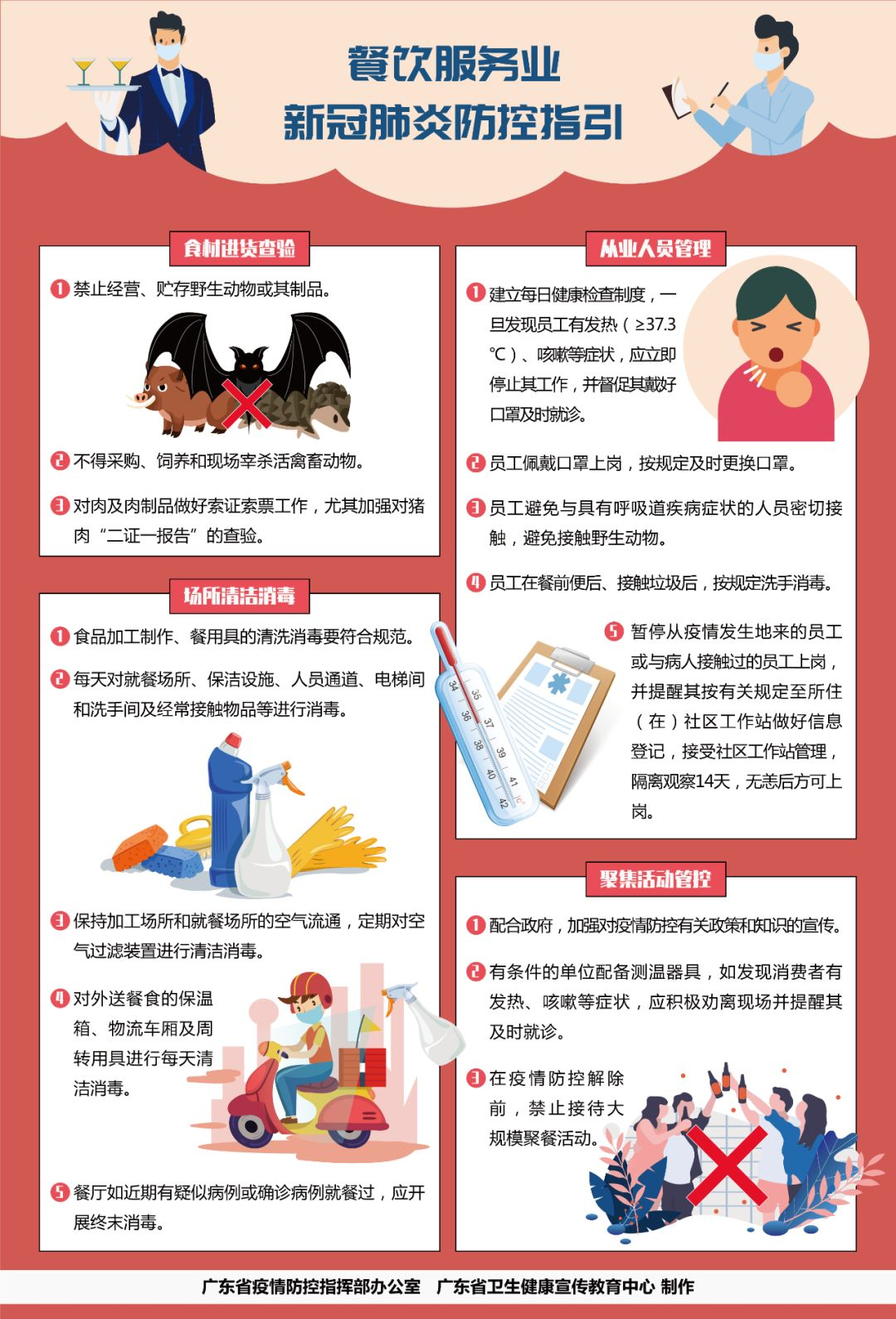 1、嚴(yán)格按照《機(jī)關(guān)、企業(yè)及工廠節(jié)后復(fù)工防控新型冠狀病毒肺炎工作指引》(粵衛(wèi)疾控函〔2020〕14號(hào))、《餐飲服務(wù)食品安全操作規(guī)范》要求以及國(guó)家衛(wèi)生健康委員會(huì)《新型冠狀病毒感染的肺炎防控方案》《新型冠狀病毒感染的肺炎公眾防護(hù)指南》等防控要求,建立健全防控制度,壓實(shí)防控責(zé)任,嚴(yán)格從業(yè)人員管理,杜絕從業(yè)人員帶病上崗。