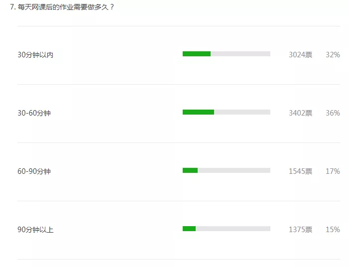 根據(jù)投票結(jié)果,68%的人認(rèn)為網(wǎng)課后的作業(yè)在60分鐘內(nèi)可以完成。不過(guò),許多參與者認(rèn)為網(wǎng)課后的作業(yè)對(duì)于家長(zhǎng)來(lái)說(shuō)負(fù)擔(dān)較重。
