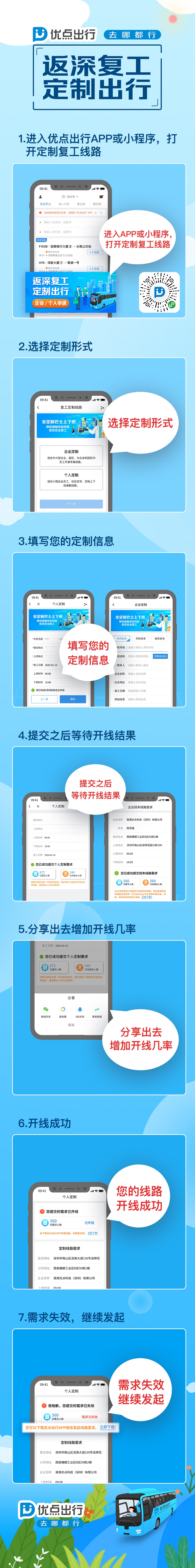 復(fù)工企業(yè)和個(gè)人在“優(yōu)點(diǎn)出行”APP或“優(yōu)點(diǎn)巴士”小程序中提交申請(qǐng)、填寫復(fù)工出行需求,由優(yōu)點(diǎn)出行平臺(tái)聚合生成復(fù)工專線并通知乘客,深圳巴士集團(tuán)提供安全消毒的車輛進(jìn)行乘客運(yùn)輸。