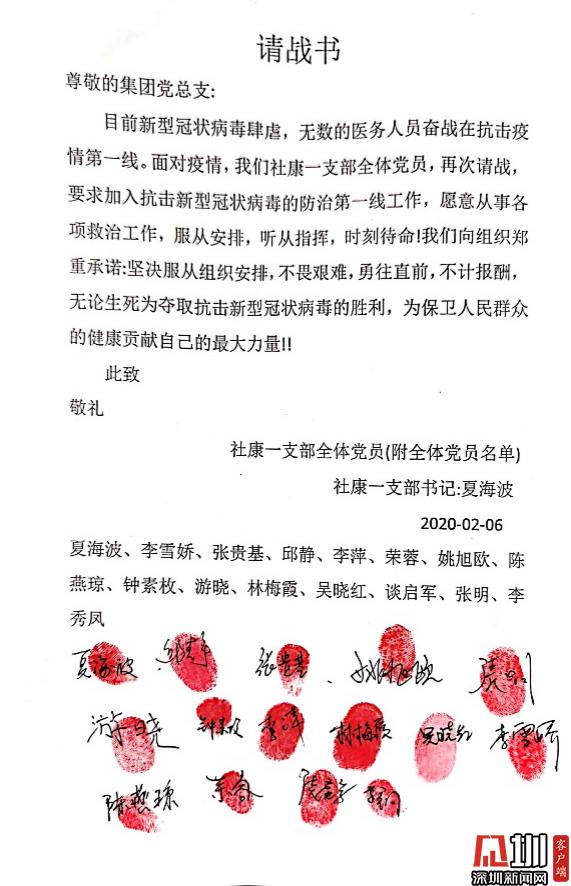 見圳客戶端·深圳新聞網(wǎng)訊(記者 董非)“讓黨旗在防控斗爭(zhēng)第一線高高飄揚(yáng)?!毙鹿诜窝滓咔榘l(fā)生以來,南山區(qū)醫(yī)療集團(tuán)總部黨員勇當(dāng)先鋒,以實(shí)際行動(dòng)踐行初心使命,涌現(xiàn)出眾多感人故事,展現(xiàn)了共產(chǎn)黨員的風(fēng)采與擔(dān)當(dāng)。 疫情發(fā)生后,南山區(qū)第一時(shí)間制定出臺(tái)了《黨建引領(lǐng)疫情防控工作五項(xiàng)行動(dòng)方案》,南山區(qū)委書記王強(qiáng)號(hào)召全體黨員,發(fā)揮黨組織的戰(zhàn)斗堡壘作用和黨員的先鋒模范作用,全力保障人民群眾生命安全和身體健康,讓黨旗在防控疫情斗爭(zhēng)第一線高高飄揚(yáng),堅(jiān)決打贏疫情防控人民戰(zhàn)爭(zhēng)、總體戰(zhàn)、阻擊戰(zhàn)。南山區(qū)醫(yī)療集團(tuán)總部積極響應(yīng),黨建引領(lǐng)下的防控抗疫工作有序科學(xué)地展開。 今年1月底,深圳市南山區(qū)區(qū)委授旗成立南山醫(yī)療系統(tǒng)黨員突擊隊(duì)。南山區(qū)醫(yī)療集團(tuán)總部緊急組建了防控新冠肺炎應(yīng)急突擊隊(duì),僅一天內(nèi)區(qū)醫(yī)療集團(tuán)就共有169人完成第一批應(yīng)急突擊隊(duì)報(bào)名,其中黨員過半數(shù)。 疾風(fēng)知?jiǎng)挪荩一馃捳娼?。一封封?qǐng)戰(zhàn)書閃電匯聚到黨總支,召即來,來能戰(zhàn),戰(zhàn)能勝,沖鋒在前就是擔(dān)當(dāng)?shù)淖蠲姥堇[;一位位黨員迅速入隊(duì)黨員突擊隊(duì),他們重溫入黨誓言,在黨旗下實(shí)踐著醫(yī)者仁心、人間大愛;一份份入黨申請(qǐng)書紛沓而來,特殊時(shí)期經(jīng)受特殊考驗(yàn),一批優(yōu)秀的醫(yī)護(hù)人員頁主動(dòng)向黨組織靠攏。鏗鏘的語言、堅(jiān)定的決心、舍我的擔(dān)當(dāng),是南山區(qū)醫(yī)療集團(tuán)總部廣大黨員逆行而上、抗擊疫情的堅(jiān)定決心和必勝信心。 最美逆行黨支部,積極請(qǐng)戰(zhàn)敢擔(dān)當(dāng) “我是共產(chǎn)黨員,我請(qǐng)戰(zhàn)!愿為戰(zhàn)勝疫情全力以赴!”這是南山區(qū)醫(yī)療集團(tuán)總部一支部13名黨員和2名入黨積極分子聯(lián)名撰寫的《請(qǐng)戰(zhàn)書》(節(jié)選)。 面對(duì)新冠肺炎疫情,一支部黨員在夏海波支部書記夏海波的帶領(lǐng)下,在發(fā)熱門診、發(fā)熱患者預(yù)檢分診、社區(qū)“三位一體”排查等工作中,積極發(fā)揮共產(chǎn)黨員戰(zhàn)斗在一線、沖鋒在一線的模范帶頭作用,為戰(zhàn)勝新冠肺炎疫情全體黨員積極主動(dòng)請(qǐng)戰(zhàn),并向集團(tuán)黨總支遞交了請(qǐng)戰(zhàn)書。 社康一支部全體黨員的請(qǐng)戰(zhàn)書 一個(gè)個(gè)紅手印,令人淚目,彰顯著南山區(qū)醫(yī)療集團(tuán)總部白衣天使們逆行而上的使命擔(dān)當(dāng)和責(zé)任意識(shí)。 一支部書記夏海波說,“成為疫情防控工作第一線發(fā)展黨員,是面對(duì)疫情充分發(fā)揮黨員先鋒作用的具體實(shí)踐。此次請(qǐng)戰(zhàn),將更加激勵(lì)他們我們?cè)诮窈蟮墓ぷ魈貏e是近期防疫防控工作中,以黨員的標(biāo)準(zhǔn)嚴(yán)格要求自己,發(fā)揮黨員先鋒模范作用。同時(shí),也會(huì)對(duì)全院全體員工產(chǎn)生積極引領(lǐng)、鼓舞作用,以更飽滿的斗志投入防疫防控工作?!?/p> 老黨員重溫入黨誓詞,面對(duì)黨旗表決心 “我宣誓:我志愿加入中國(guó)共產(chǎn)黨……”這是一次特別的宣誓。接到組織號(hào)召后,社康二支部的老黨員鐘達(dá)宏和吳麗娉,對(duì)著黨旗,以重溫入黨誓詞的方式,不忘黨員初心,牢記使命,積極沖鋒在前,誓要打贏防控狙擊戰(zhàn)。 社康二支部的老黨員鐘達(dá)宏和吳麗娉,對(duì)著黨旗,重溫入黨誓詞,誓要打贏防控狙擊戰(zhàn) 面對(duì)來勢(shì)洶洶的疫情,南山區(qū)醫(yī)療集團(tuán)總部的黨組織和黨員干部不但沒有被嚇倒,反而激起了他們昂揚(yáng)的戰(zhàn)斗意志和飽滿的工作熱情。 “我宣誓,我自愿加入抗擊新型冠狀病毒肺炎疫情防控工作隊(duì)伍,責(zé)任上肩,聽黨指揮,服從命令,科學(xué)應(yīng)對(duì),恪盡職守,努力守護(hù)轄區(qū)居民健康,堅(jiān)決打贏疫情防控攻堅(jiān)戰(zhàn)!”守土有責(zé)、守土擔(dān)責(zé)、守土盡責(zé),所有社康中心的黨員干部將筑牢抗疫的基層防線,誓要守護(hù)轄區(qū)居民的生命健康。 社康二支部黨員在黨旗下宣誓努力守護(hù)轄區(qū)居民健康 艱難時(shí)刻主動(dòng)請(qǐng)戰(zhàn),夫妻雙雙奮戰(zhàn)一線 1月26日,南山區(qū)醫(yī)療集團(tuán)總部下發(fā)關(guān)于組建防控新型冠狀病毒感染肺炎應(yīng)急突擊隊(duì)報(bào)名的通知。除了得到集團(tuán)黨員們的積極響應(yīng)之外,各個(gè)支部涌現(xiàn)出一波遞交入黨申請(qǐng)書的小高潮。 李婧是社康支部的一名全科醫(yī)生,一直在社康醫(yī)院中心從事全科醫(yī)療工作,戰(zhàn)“疫”的號(hào)角吹響,李婧第一時(shí)間參戰(zhàn),在所有抗疫時(shí)期入黨人員里第一個(gè)遞交了手寫入黨申請(qǐng)書。 李婧醫(yī)生的手寫入黨申請(qǐng)書 起初,她所在的蔚藍(lán)海岸社康中心考慮到李婧的愛人是深圳市公立醫(yī)院急診科醫(yī)生其愛人是深圳市某公立醫(yī)院的急診科醫(yī)生,疫情發(fā)生以來一直堅(jiān)守在崗位上,家中尚有1歲零3個(gè)月的寶寶,就沒有讓她參加社區(qū)“三位一體”排查和