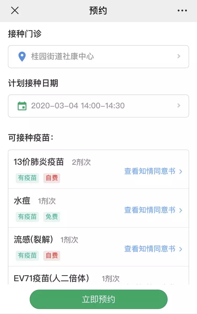 2.成功關(guān)聯(lián)寶寶后,點擊立即預(yù)約,選擇接種機構(gòu)及計劃接種日期,查看可接種疫苗的針次及疫苗庫存,確認無誤后立即預(yù)約。