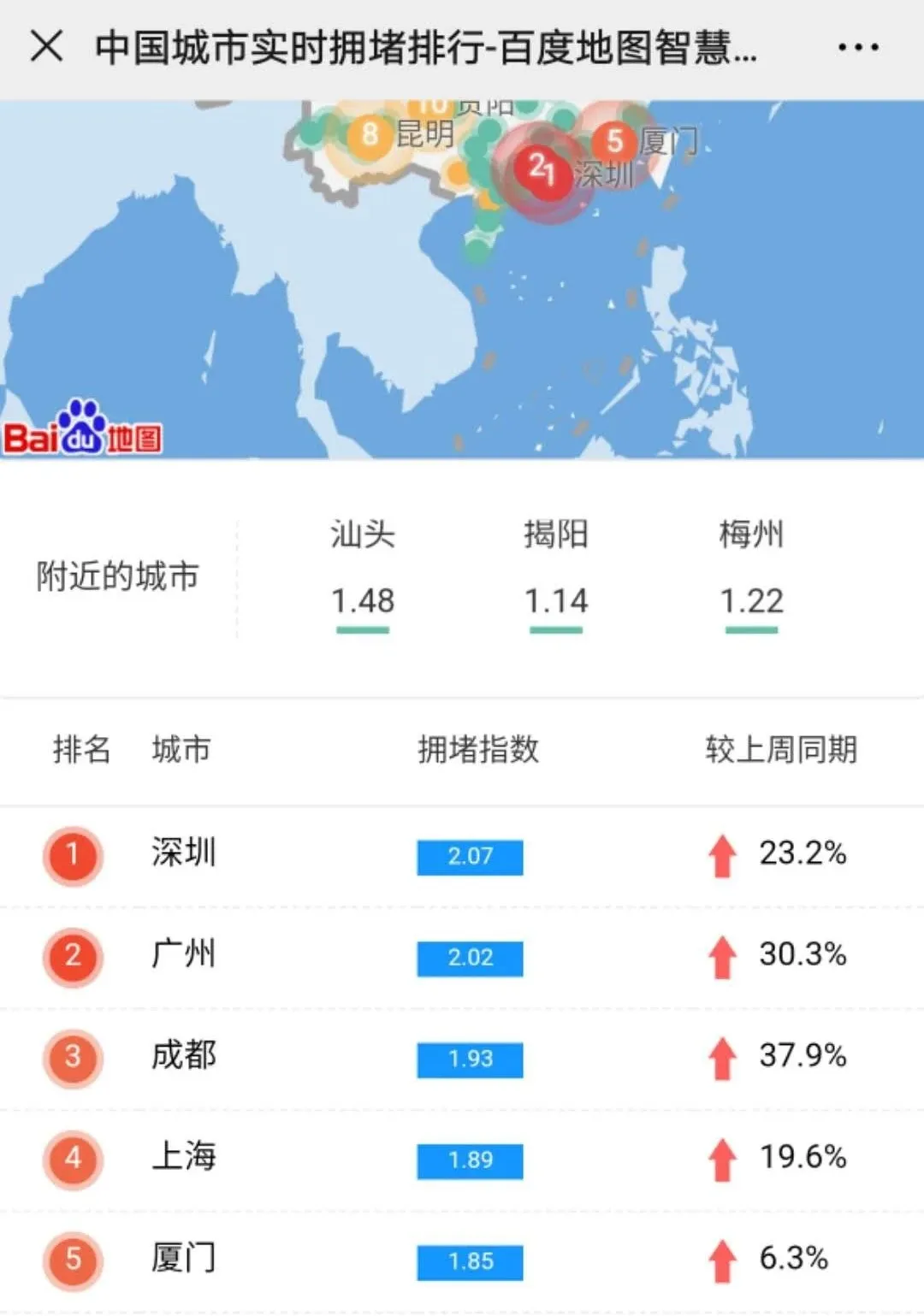 據(jù)百度地圖提供的中國城市實(shí)時(shí)擁堵排行來看,3月2日19時(shí)許,深圳擁堵指數(shù)為2.07,位居全國榜首。