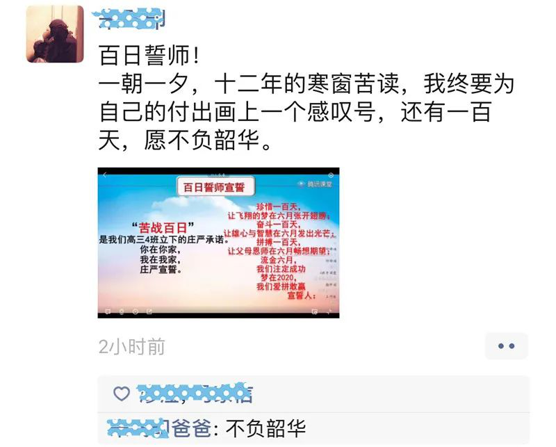 “生于非典,考于新冠,2020,我們注定不凡!疫情當(dāng)前,雖然我們隔離在家,不能像往屆那樣,齊聚學(xué)校體育館舉行誓師大會(huì),意氣風(fēng)發(fā)地走進(jìn)學(xué)校精心準(zhǔn)備的“成功門”,伴隨奮進(jìn)的樂聲高喊出我們的誓言,在“簽名紀(jì)念墻”上寫下對未來的期盼。但即使相隔網(wǎng)絡(luò)兩端,我們依然有老師祝福和引導(dǎo),有家長的鼓勵(lì)和支持,有同窗的幫助和陪伴,高考百日,我們?nèi)栽谝黄鹫癖鄹吆簦?020高考,我們準(zhǔn)備好了?!?/p>