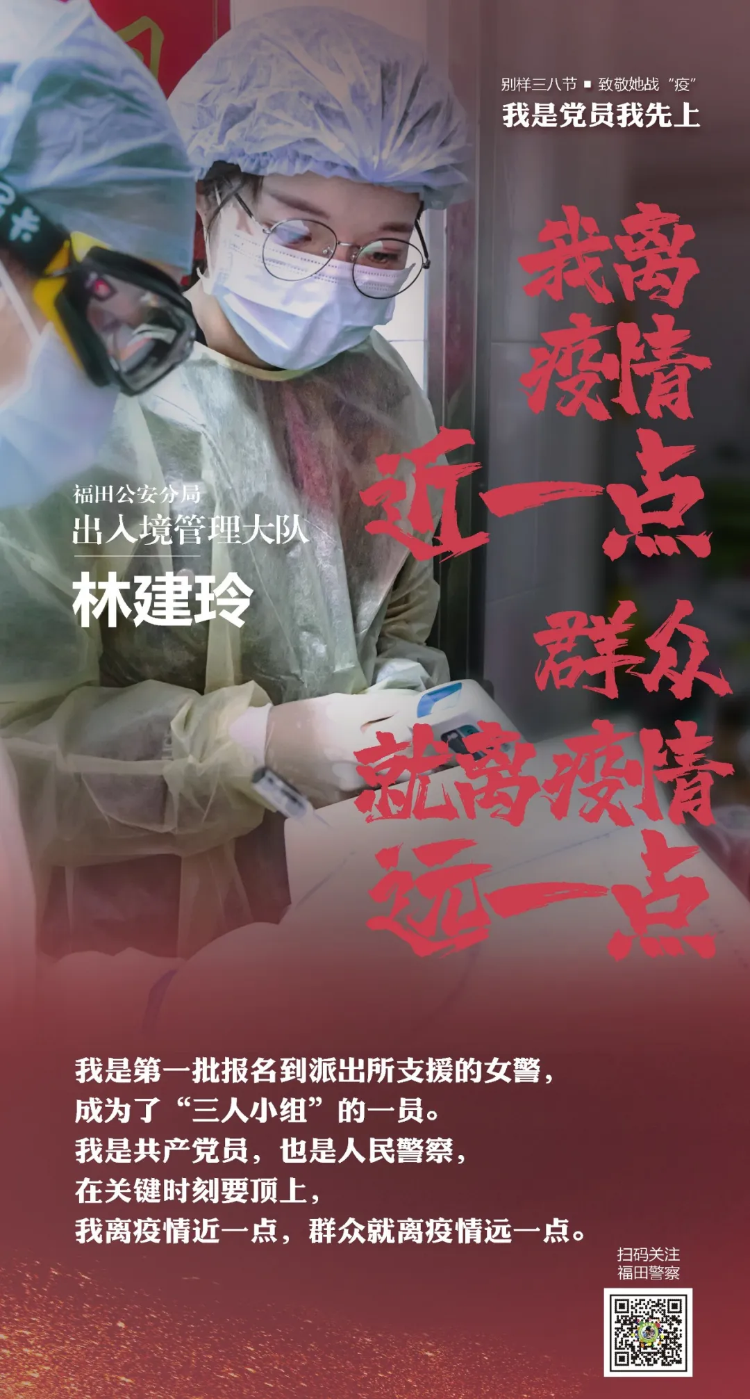 長期在窗口服務(wù)的出入境管理大隊女民警林建玲主動請戰(zhàn),成為分局黨員突擊隊首批隊員,奔赴一線,支援抗疫。