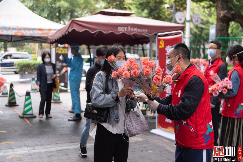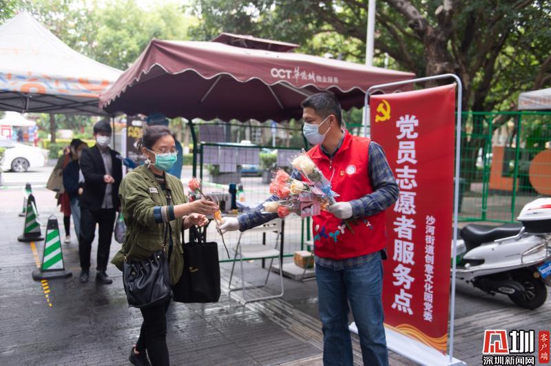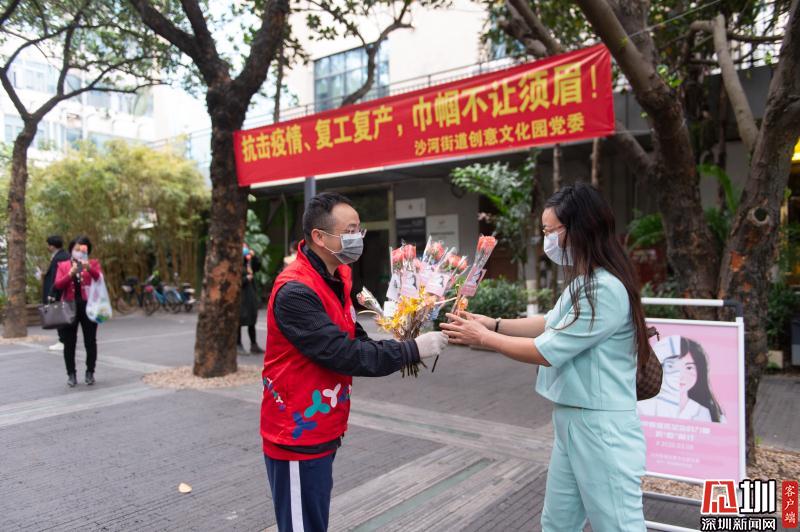 見圳客戶端·深圳新聞網(wǎng)2020年3月6日訊 3月6日上午,春暖花開,萬物更新。華僑城創(chuàng)意文化T街入口,進(jìn)入園區(qū)上班的員工除了接受體溫檢測、出示入園卡等常規(guī)動(dòng)作外,女員工意外收到了一束鮮花和一張“三八”節(jié)賀卡,賀卡上寫著:帶著溫柔堅(jiān)定的力量抗“疫”前行!這是園區(qū)黨員志愿者對“抗擊疫情、復(fù)工復(fù)產(chǎn)”中廣大女職工的禮贊。