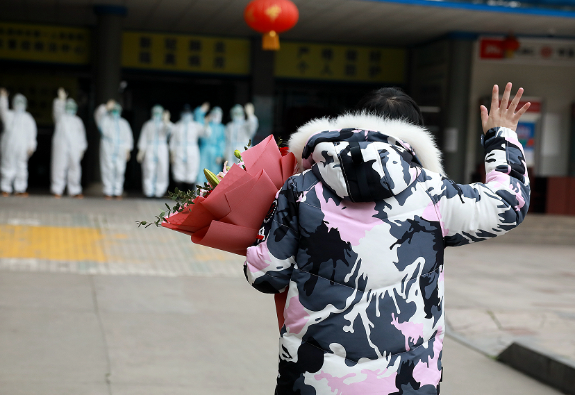 不一會兒,7名穿著防護服的醫(yī)護人員將張冬雪護送了出來。剛一露面,人群中立刻響起一陣掌聲。2位早已在大門外等候的護士激動地上前與張冬雪擁抱,段昌奉也沖上去把飽含大家祝福和關(guān)心的鮮花獻給她。張冬雪笑著向人群揮手,走了幾步后,又回頭向依然站在門口目送她的7名醫(yī)護人員深深鞠了一躬,“謝謝,謝謝你們。”