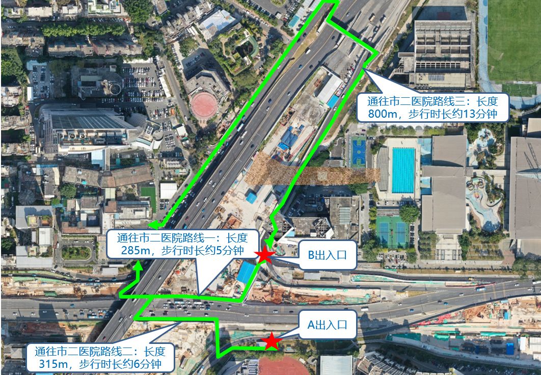 1.去往市二醫(yī)院的市民可從地鐵黃木崗站B出入口出站,沿地面新建的風(fēng)雨連廊到達(dá)(步行時(shí)間約5分鐘)。(詳見(jiàn)圖1)