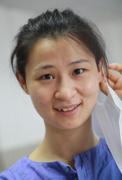 黃青青性格開朗,適應能力強,她平時不愛吃的胡蘿卜、包菜等食物,但到了一線再也不挑食了。身材瘦弱的她在忙碌十多天后有些消瘦,但她總是打趣道:“別看我瘦,力量可大著呢!”協(xié)助病人翻身,耐心為病人喂飯,只要病人需要的,她都會盡自己的全力做好,病區(qū)的病人也為她豎起大拇指。
