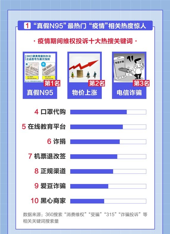 深圳商報2020年3月15日訊 360搜索、360瀏覽器今日發(fā)布《315消費者維權數據報告》(以下簡稱《報告》)。報告顯示,“真假N95”、“口罩代購”等與口罩質量相關的訊息成熱議話題。