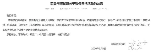 據(jù)統(tǒng)計,截至3月15日17時,深圳、汕頭、中山等地發(fā)文明確,全市暫停祭掃服務(wù),倡導(dǎo)通過家庭追思、網(wǎng)絡(luò)祭掃、書寫寄語等方式遙祭先人、慎終追遠(yuǎn)。此外,韶關(guān)市殯儀館暫停2020年清明祭祀活動。