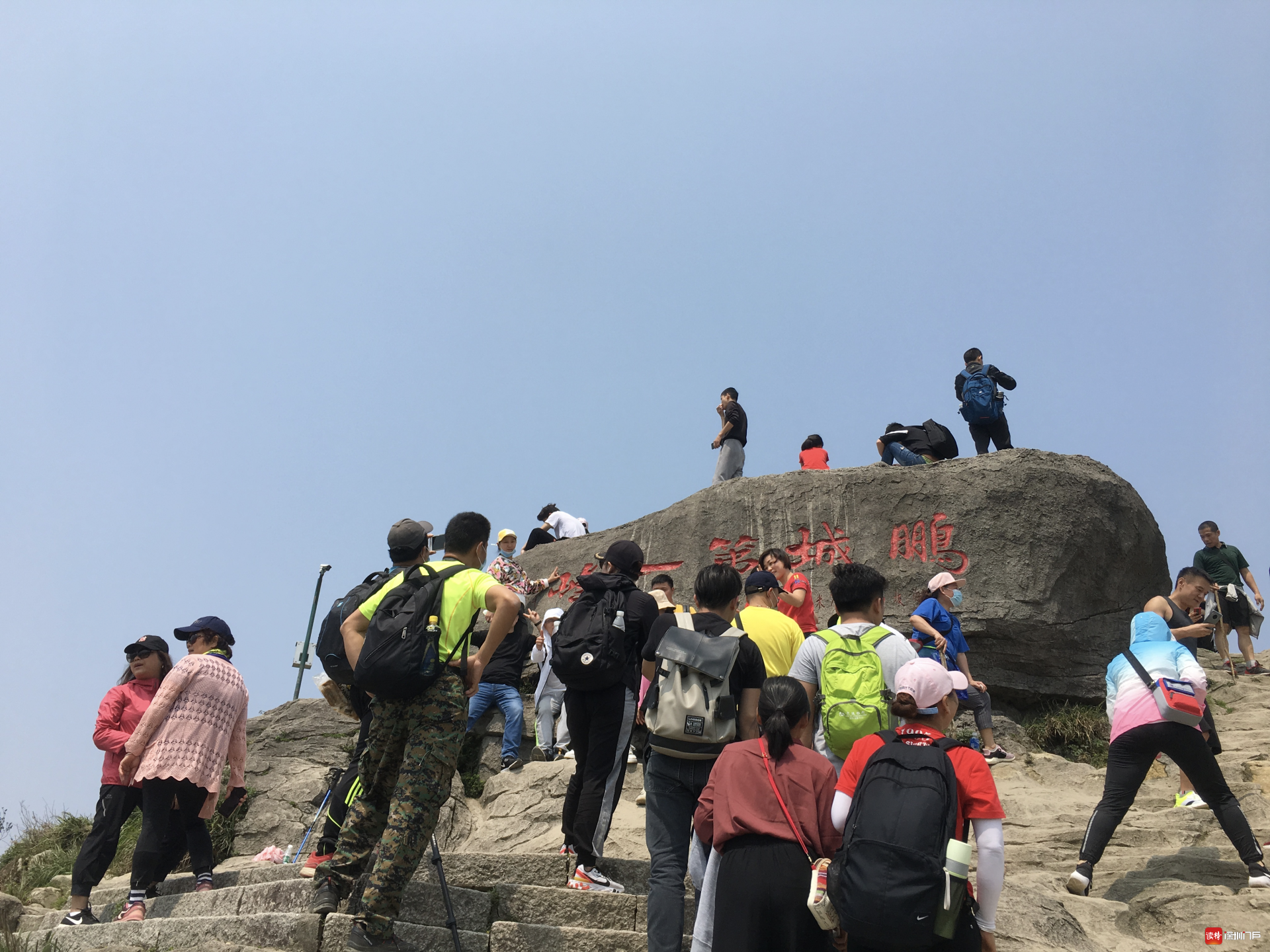 好漢坡是去往大梧桐的登山道之一,長度有100多米,非常陡峭,但游人卻比其他登山道多了許多。整個(gè)陡坡中部種滿一排杜鵑,吸引游人前往觀賞和拍照。在大梧桐,刻有“鵬城第一峰”的巨石是海拔最高處,是整個(gè)梧桐山游客最密集的地方。在巨石前,拍照需要排隊(duì),還有游客對著群山吶喊。