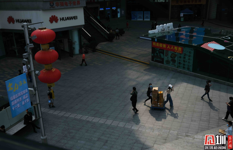 3月16日,華強(qiáng)北步行街上,人流量明顯增多,兩位推著平板車運送貨物的人走過。