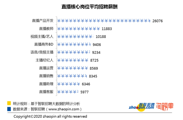 知識(shí)、技術(shù)密集型和資源密集型的崗位往往工資更高,這對(duì)于直播人才也同樣適用。細(xì)分來看,負(fù)責(zé)直播界面設(shè)計(jì)、開發(fā)、測(cè)試、運(yùn)維等多階段把控的直播產(chǎn)品開發(fā)崗位以26076元/月的高薪位居薪酬第一。此外,直播教師的平均薪資達(dá)到11883元/月;直播招聘“顏值”需求最高的,視頻主播/藝人的平均薪資為10188元/月。而同樣作為直播主角的語音主播,由于門檻更低,平均薪資是視頻主播的9成。