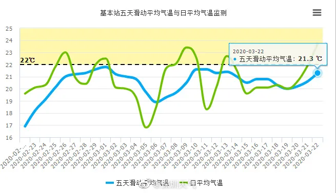以5天滑動(dòng)平均氣溫穩(wěn)定>22 ℃ 為春季結(jié)束、夏季開始,看圖一中的藍(lán)色曲線(五天滑動(dòng)平均氣溫)已經(jīng)在抬頭了,能不突破虛線還得看接下來(lái)幾天的氣溫。