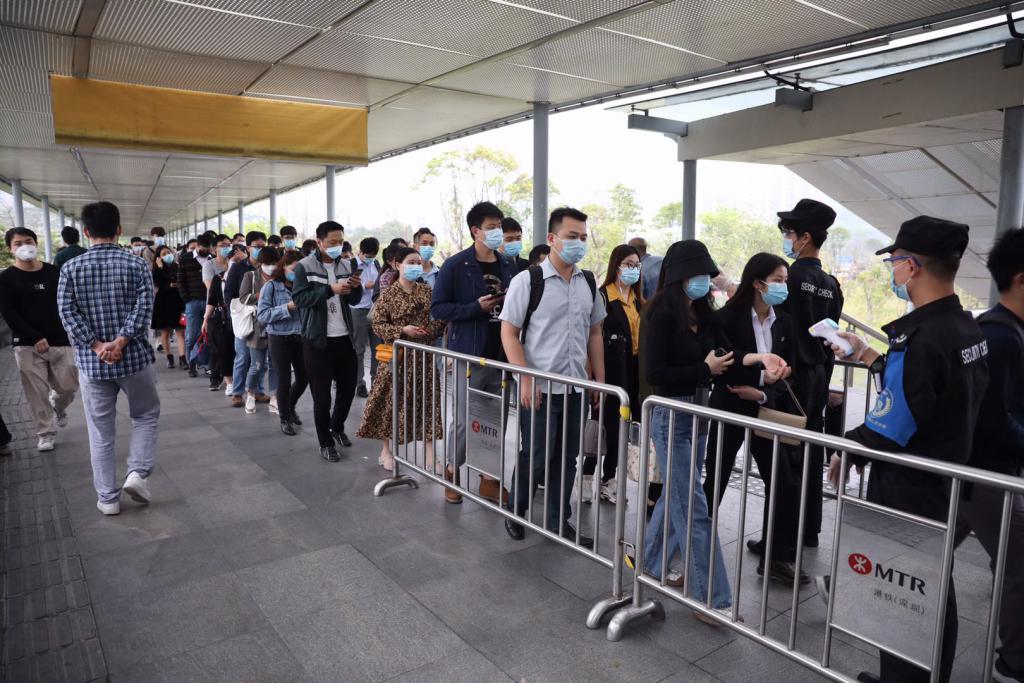7點30分,深晚另一路記者從五號線長龍站進站,進站較順利沒有排長隊,但是車上較擁擠,沒有座位。到達深圳北站后,在轉4號線去民樂站時排起了長隊,大概等了13分鐘,才勉強擠進4號線,車上幾乎沒有空間,身體無法動彈。8點17分從民樂出站,連同排隊等車,9站地鐵一共用時近50分鐘。