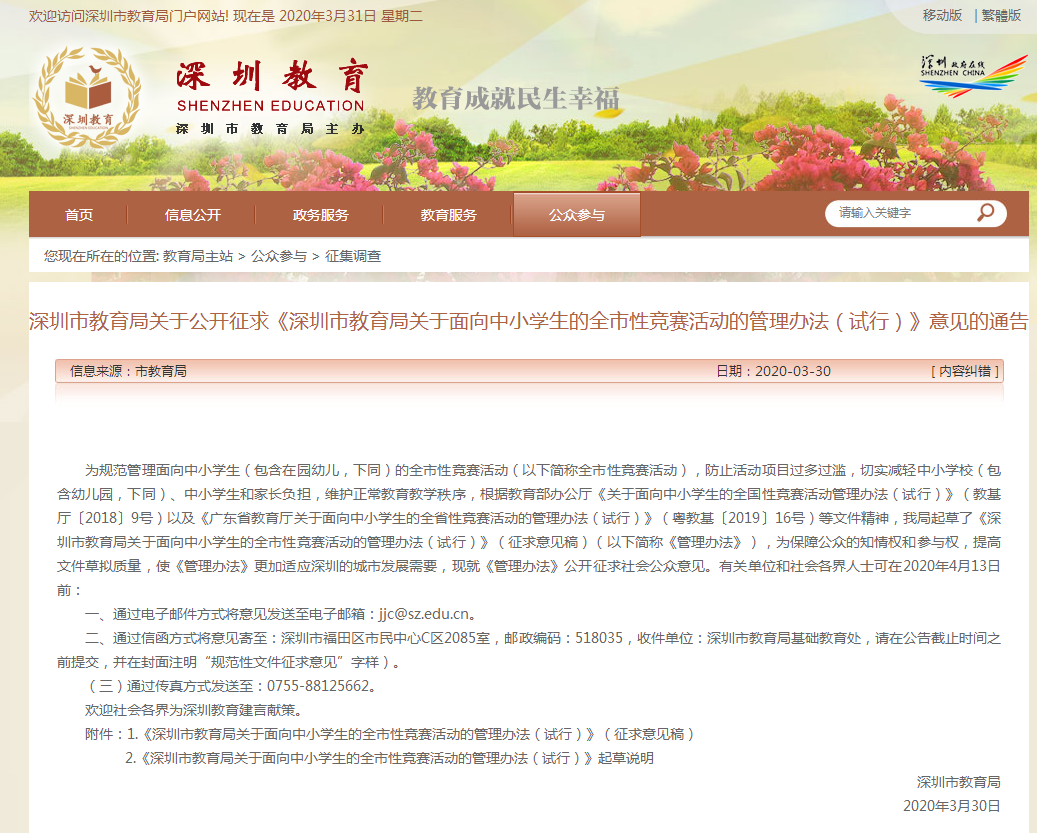 為保障公眾的知情權(quán)和參與權(quán),提高文件草擬質(zhì)量,使《管理辦法》更加適應(yīng)深圳的城市發(fā)展需要,深圳市教育局現(xiàn)就《辦法》公開征求社會公眾意見。有關(guān)單位和社會各界人士可在2020年4月13日前: