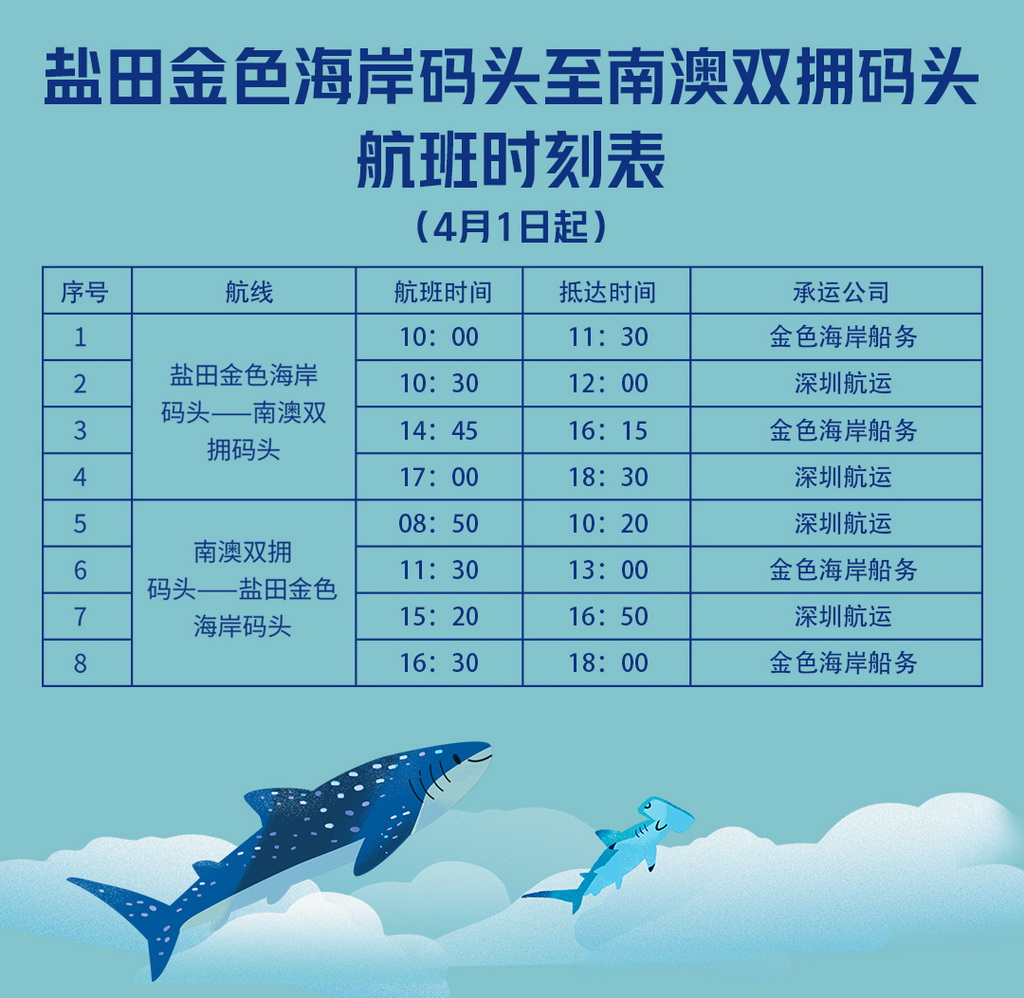 據(jù)了解,“鹽田-南澳”海上交通往返航線自3月12日正式復(fù)航,每天共4班。深圳航運(yùn)集團(tuán)增開(kāi)后,該航線航班數(shù)量將恢復(fù)至疫情前的水平,達(dá)到每天8班。其中,由鹽田金色海岸碼頭至南澳雙擁碼頭新增航班時(shí)間為:10時(shí)30分和17時(shí);由南澳雙擁碼頭至鹽田金色海岸碼頭新增航班時(shí)間為8時(shí)50分和15時(shí)20分。廣大市民及旅客朋友可通過(guò)深圳航運(yùn)旗下公眾號(hào)“鵬星會(huì)”查詢(xún)航班信息及訂票,單程成人票60元/人。