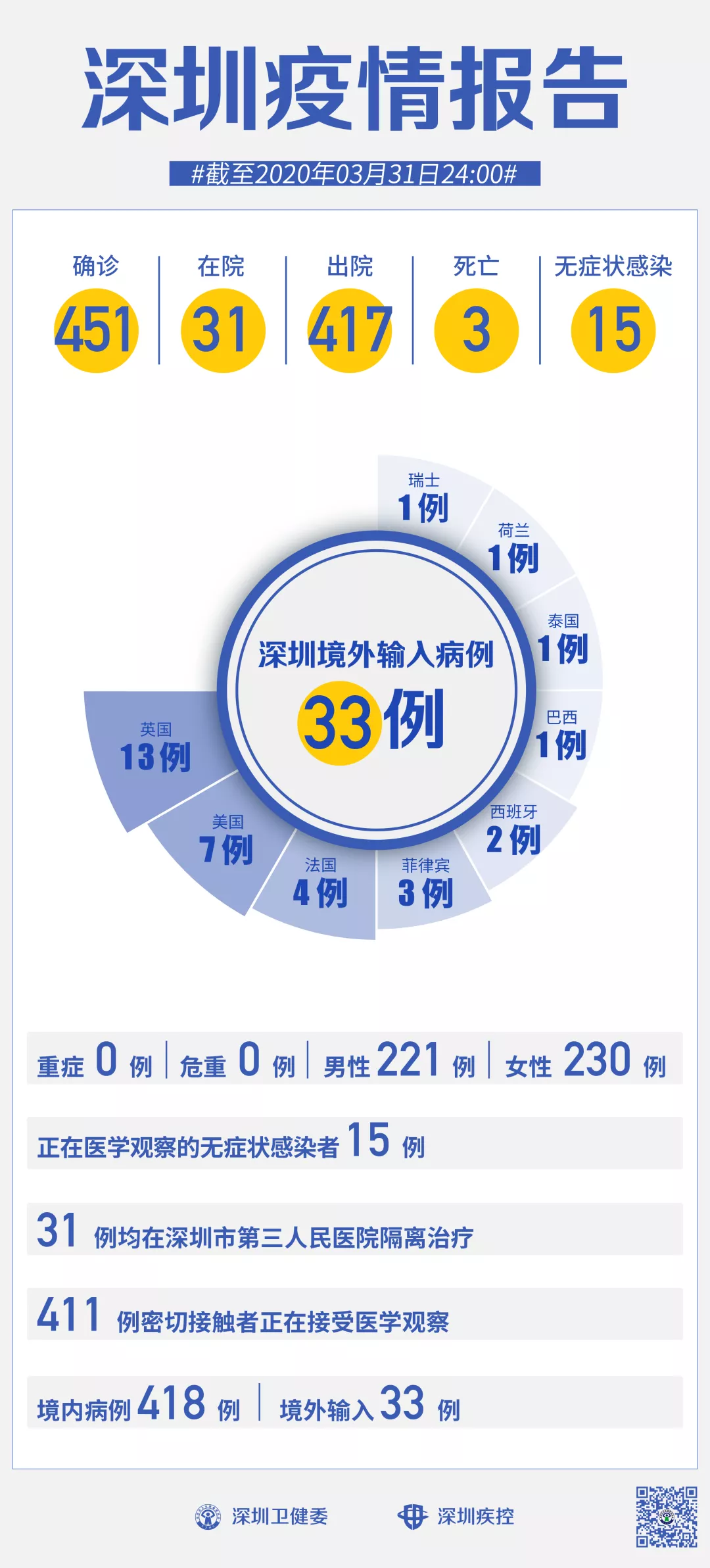 截至3月31日24時,深圳累計(jì)報(bào)告新冠肺炎病例451例。3月31日當(dāng)天新增境內(nèi)病例1例、無癥狀感染者1例。 【境內(nèi)病例】:新增1例湖北返深確診病例,出院1例,累計(jì)報(bào)告境內(nèi)病例418例。 【境外輸入】:當(dāng)日無新增病例,累計(jì)報(bào)告境外輸入病例33例。 【無癥狀感染者】:新增1例湖北返深無癥狀感染者。全市尚在醫(yī)學(xué)觀察的無癥狀感染者15例,其中境外輸入9例。 累計(jì)報(bào)告確診病例中,男性221例、女性230例。 目前,死亡3例,累計(jì)出院417例。31例確診病例均在深圳市第三人民醫(yī)院隔離治療。 411名密切接觸者正在接受醫(yī)學(xué)觀察。 無癥狀感染者7問7答 01.什么是新型冠狀病毒無癥狀感染者? 新冠病毒無癥狀感染者(以下簡稱無癥狀感染者)是指無相關(guān)臨床癥狀,如發(fā)熱、咳嗽、咽痛等可自我感知或可臨床識別的癥狀與體征,但呼吸道等標(biāo)本新冠病毒病原學(xué)檢測陽性者。無癥狀感染者可分為兩種情形: 一是感染者核酸檢測陽性,經(jīng)過14天潛伏期的觀察,均無任何可自我感知或可臨床識別的癥狀與體征,始終為無癥狀感染狀態(tài); 二是感染者核酸檢測陽性,采樣時無任何可自我感知或可臨床識別的癥狀與體征,但隨后出現(xiàn)某種臨床表現(xiàn),即處于潛伏期的“無癥狀感染”狀態(tài)。 02.無癥狀感染者有無傳染性? 根據(jù)國家和部分省份開展的密切接觸者監(jiān)測數(shù)據(jù),無癥狀感染者的密切接觸者存在二代病例續(xù)發(fā),流行病學(xué)調(diào)查中發(fā)現(xiàn)個別由無癥狀感染者導(dǎo)致的聚集性疫情,有小樣本量的研究顯示無癥狀感染者呼吸道樣本中的病毒載量與確診病例沒有太大差異。 綜合目前的監(jiān)測和研究,無癥狀感染者存在傳染性,但其傳染期長短、傳染性強(qiáng)弱、傳播方式等尚需開展進(jìn)一步科學(xué)研究。 部分專家認(rèn)為鑒于無癥狀感染者的呼吸道標(biāo)本能檢出病原核酸,但由于無咳嗽、打噴嚏等臨床癥狀,病原排出體外引起傳播的機(jī)會較確診病例相對少一些。 03.我國關(guān)于新型冠狀病毒無癥狀感染者的防控要求是什么? 國家衛(wèi)生健康委在1月28日發(fā)布《新冠病毒感染的肺炎防控方案》(第三版)中就將新型冠狀病毒無癥狀感染者納入防控管理,在其后的修訂過程中均對無癥狀感染者的報(bào)告、管理等提出了明確具體的要求。各級各類醫(yī)療衛(wèi)生機(jī)構(gòu)發(fā)現(xiàn)無癥狀感染者,應(yīng)于2小時內(nèi)進(jìn)行網(wǎng)絡(luò)直報(bào)。 縣(區(qū))級疾控機(jī)構(gòu)接到無癥狀感染者報(bào)告后,24小時內(nèi)完成個案調(diào)查,并及時進(jìn)行密切接觸者登記,將個案調(diào)查表或調(diào)查報(bào)告及時通過傳染病報(bào)告管理信息系統(tǒng)進(jìn)行上報(bào)。 無癥狀感染者應(yīng)集中隔離14天,原則上集中隔離滿14天且兩次連續(xù)標(biāo)本核酸檢測陰性者(采樣時間至少間隔24小時)可解除隔離; 如果核酸檢測仍為陽性者,則繼續(xù)隔離醫(yī)學(xué)觀察。 隔離醫(yī)學(xué)觀察期間如出現(xiàn)臨床表現(xiàn),應(yīng)及時轉(zhuǎn)歸為確診病例,進(jìn)行規(guī)范治療。 無癥狀感染者密切接觸者也要進(jìn)行14天的集中隔離醫(yī)學(xué)觀察。 04.無癥狀感染者通過什么途徑發(fā)現(xiàn)?截至目前我國發(fā)現(xiàn)了多少例無癥狀感染者? 目前我們主要通過以下途徑主動發(fā)現(xiàn)無癥狀感染者: 一是對新型冠狀病毒肺炎病例的密切接觸者開展醫(yī)學(xué)觀察期間的主動檢測; 二是在聚集性疫情調(diào)查中開展的主動檢測; 三是在新型冠狀病毒肺炎病例的傳染源追蹤過程中對暴露人群主動檢測; 四是對部分有境內(nèi)外新型冠狀病毒肺炎病例持續(xù)傳播地區(qū)的旅行史和居住史人員開展主動檢測。 05.如何做好無癥狀感染者的風(fēng)險(xiǎn)評估及其防控? 無癥狀感染者存在著傳播風(fēng)險(xiǎn)。 一是傳播的隱匿性。由于無癥狀感染者無任何明顯的癥狀與體征,其在人群中難以被發(fā)現(xiàn),其導(dǎo)致的傳播也難以預(yù)防。 二是癥狀的主觀性。癥狀輕微或不典型者可能認(rèn)為自己沒有感染新冠病毒,不主動去醫(yī)療機(jī)構(gòu)就診,在日常的診療工作中難以被發(fā)現(xiàn)。 三是發(fā)現(xiàn)的局限性。由于存在檢測窗口期,采用核酸檢測和血清學(xué)檢測方法難以發(fā)現(xiàn)全部無癥狀感染者,現(xiàn)有的無癥狀感染者主要是通過病例的密切接觸者主動篩查、感染來源調(diào)查、聚集性疫情調(diào)查和對高風(fēng)險(xiǎn)地區(qū)人員的主動檢測發(fā)現(xiàn)的,尚有部分無癥狀感染者難以被發(fā)現(xiàn)。 為此,要突出做好無癥狀感染者監(jiān)測,有針對性加大篩查力度,將檢測范圍擴(kuò)大至已發(fā)現(xiàn)病例和無癥狀感染者的密切接觸者、重點(diǎn)地區(qū)和重點(diǎn)人群等。一旦發(fā)現(xiàn)無癥狀感染者,要立即按“四早”要求,嚴(yán)格集中隔離和醫(yī)學(xué)觀察,對密切接觸者也要實(shí)施隔離醫(yī)學(xué)觀察。 由于部分無癥狀感染者始終無癥狀,實(shí)際防控工作中無法將發(fā)現(xiàn)和隔離無癥狀感染者作為主導(dǎo)措施。因此我們?nèi)詫⒗^續(xù)著重于及時發(fā)現(xiàn)隔離確診患者,并做好密切接觸者管理。 我