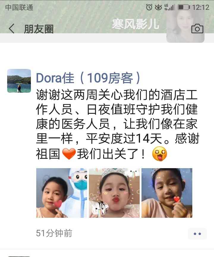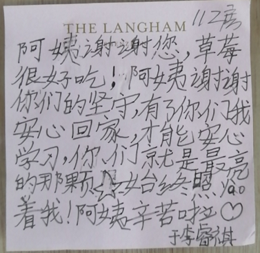 每當看到了一批批解除隔離的人開開心心地收拾行李回家,看到客人留下的感謝信、微信留言,尤其是聽到客人們離開時一句句真摯的話語,同事們都倍感欣慰,更加堅信風雨過后,終會見到彩虹。