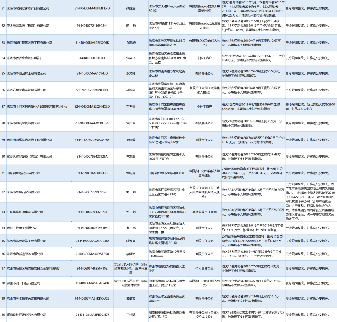 為加強對違法用人單位的社會監(jiān)督,強化誠信體系建設,加大威懾力,依據(jù)《廣東省用人單位重大勞動保障違法行為社會公布暫行規(guī)定》,省人社廳公布2020年第一批重大違法案件,涉及81家企業(yè),其中深圳豬兼強互聯(lián)網科技有限公司拖欠138名勞動者2019年5-6月工資約100.01萬元,涉嫌拒不支付勞動報酬罪,被責令限期整改,并移送公安機關。深港東成睡袋(深圳)有限公司拖欠327名勞動者2019年6-7月工資約295.8萬元,涉嫌拒不支付勞動報酬罪,被責令限期整改,處以罰款人民幣4萬元,并移送公安機關。