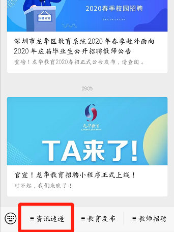 1)進(jìn)入“龍華教育”公眾號,點(diǎn)擊“資訊速遞”;