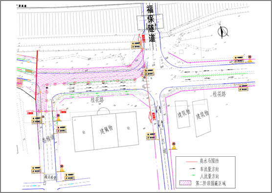 第一階段:對桂花路(福保隧道-香樟道段)南半幅(靠紅樹福苑側)進行封閉占用施工,北半幅臨時調整為三車道,一車道西行(進保稅區(qū)方向),兩車道東行(出保稅區(qū)方向)。行人及非機動車輛可通過現(xiàn)狀公園側人行道或紅樹福苑退線空間通行。自4月20日起,本階段預計持續(xù)施工60天。