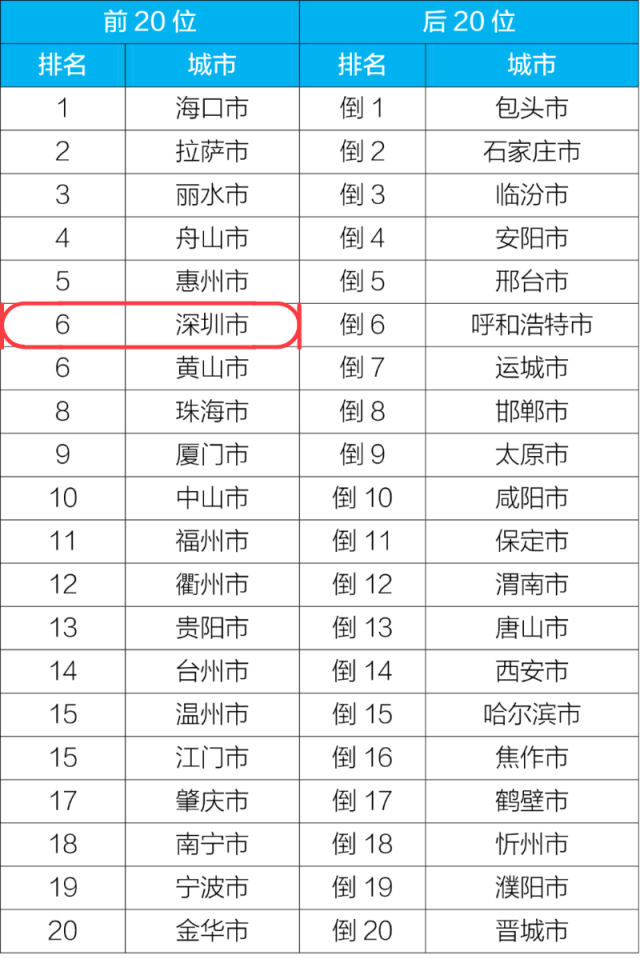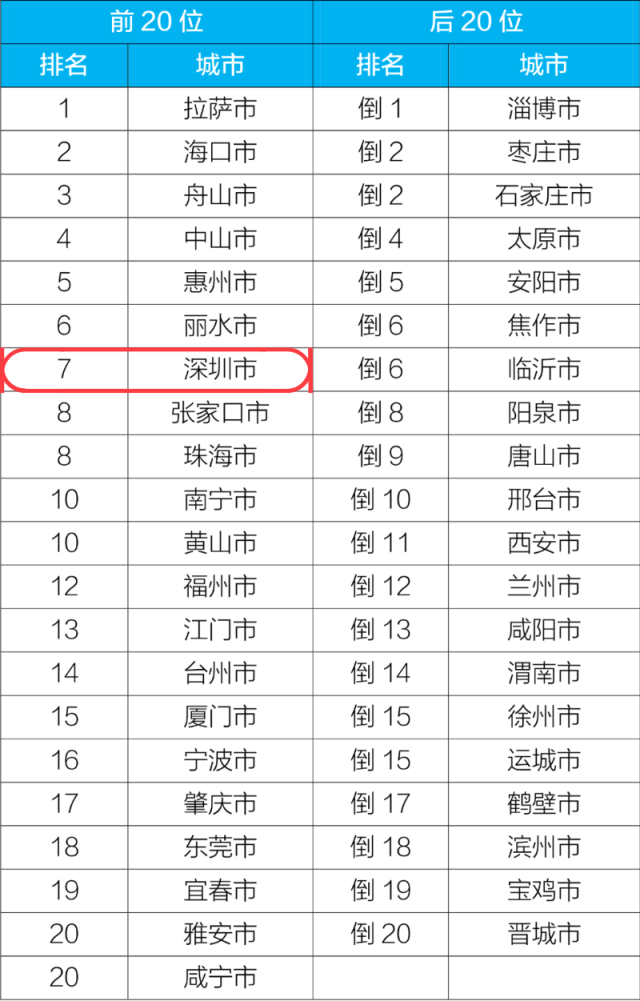 1-3月,168個重點(diǎn)城市中包頭、石家莊、臨汾市等城市空氣質(zhì)量相對較差(從倒數(shù)第1名至倒數(shù)第20名);海口、拉薩、麗水市等城市空氣質(zhì)量相對較好,深圳排名第6。