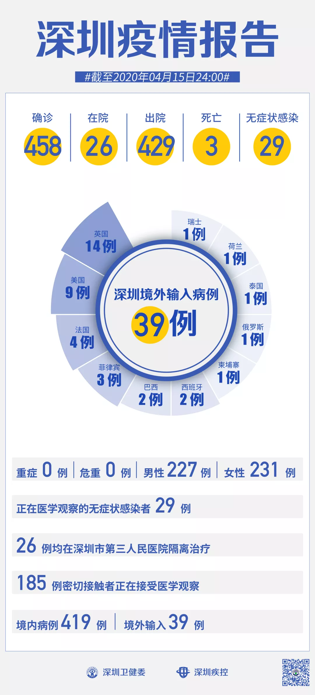 截至4月15日24時,深圳累計報告新冠肺炎病例458例。4月15日當天新增出院2例。