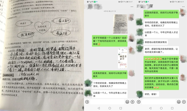 疫情來的迅猛又猝不及防,老師們一方面要完成教學(xué)任務(wù)、引導(dǎo)學(xué)生做好防疫,一方面要時刻關(guān)注學(xué)生的心理健康。學(xué)生們被迫在家度過了一個史上最長的寒假,對于處在叛逆期的孩子們來說,難免會與家人出現(xiàn)一些矛盾,在課堂之外,老師們還需要擔(dān)任“心理調(diào)節(jié)師”的角色。一次,周老師班上有個同學(xué)因為上網(wǎng)課的事情與父母鬧了矛盾,一氣之下跑到奶奶家,周老師得知了這件事情,第一時間聯(lián)系上學(xué)生,通過鼓勵、引導(dǎo),讓學(xué)生認(rèn)識到自己的錯誤,與父母和解。還有一次,周老師通過批改作業(yè),發(fā)現(xiàn)一名學(xué)生在作業(yè)中吐露了自己孤獨(dú)、無趣的心聲??吹胶螅芾蠋熈⒖膛c家長溝通了解情況,并建議家長多多陪伴孩子。盡管老師和學(xué)生們不能在學(xué)校的課堂上相聚,但在通訊十分發(fā)達(dá)的現(xiàn)在,老師們也始終用自己的方式陪伴在學(xué)生左右。