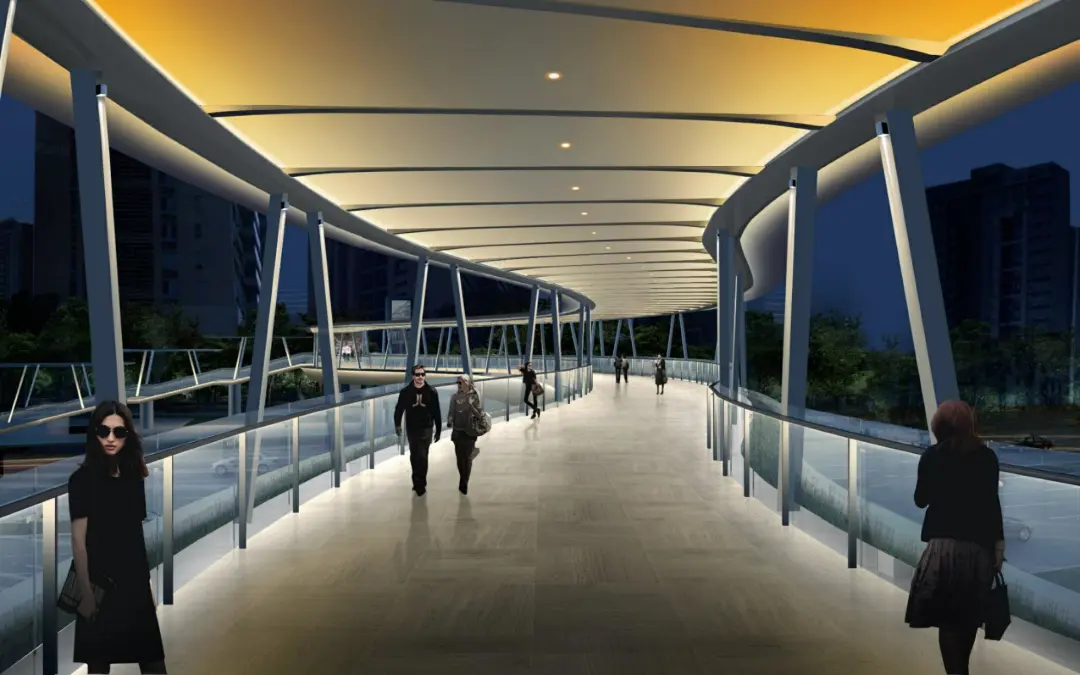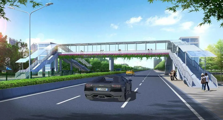 跨越南山區(qū)沙河西路,西接大沖片區(qū),東接沙河西生態(tài)長(zhǎng)廊,橋長(zhǎng)約113米,橋面凈寬約4.3米,主橋共4跨。天橋設(shè)計(jì)容景觀、造型、燈光、周邊環(huán)境于一體,設(shè)置無障礙觀光電梯,采用鋼箱梁及花崗巖面磚鋪裝、綠化自動(dòng)滴灌等。天橋的建設(shè)將大大縮短居民繞行時(shí)間,對(duì)完善周邊居民出行環(huán)境具有重要意義。