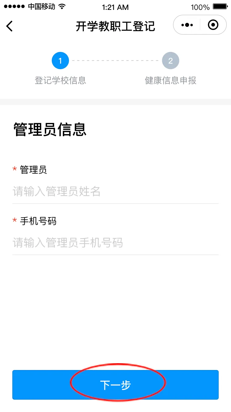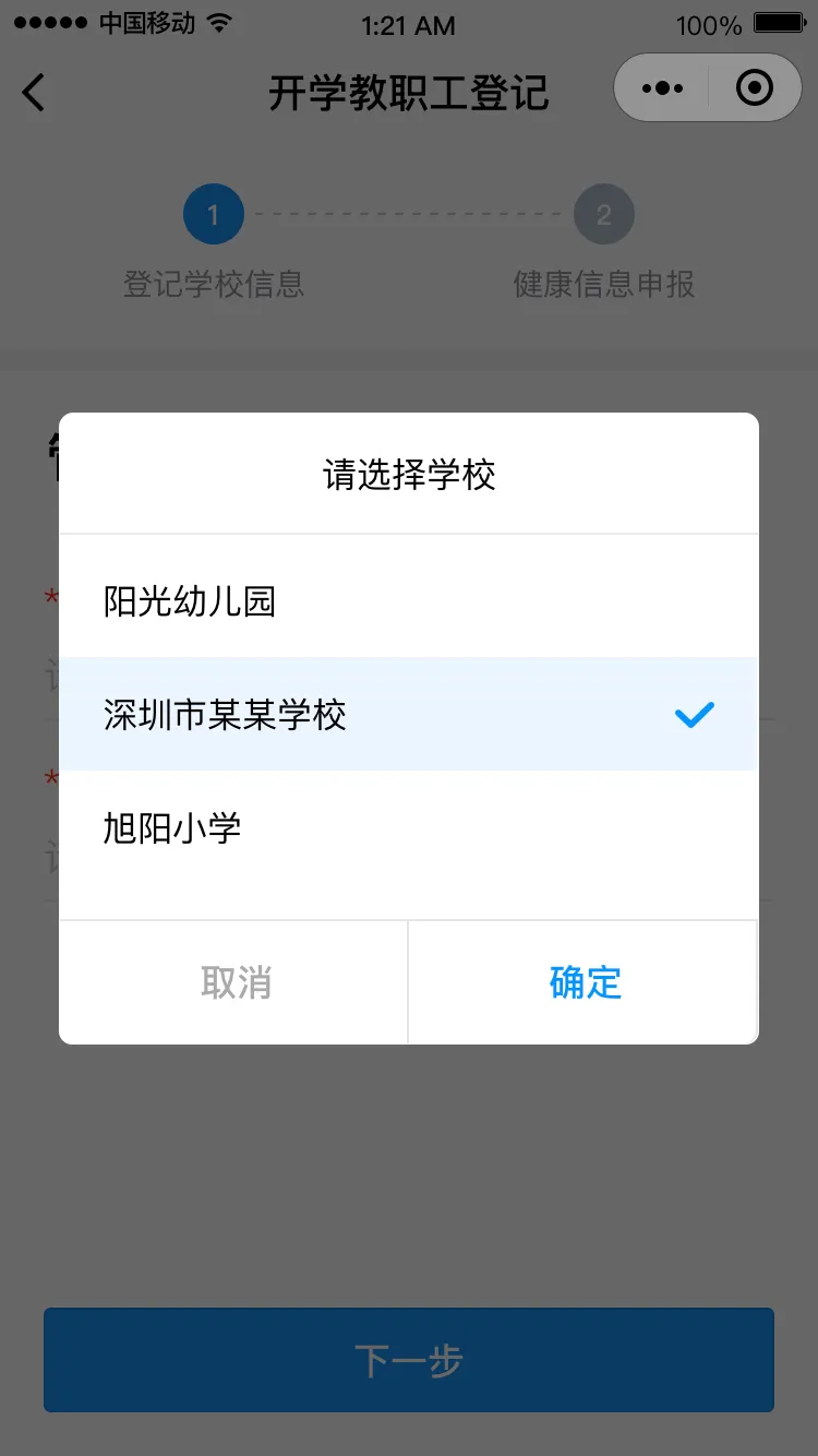 點(diǎn)擊“馬上登記”進(jìn)入登記界面,填寫(xiě)學(xué)校管理員姓名和手機(jī)號(hào)碼(學(xué)校管理員姓名和手機(jī)號(hào)碼請(qǐng)?jiān)儐?wèn)學(xué)校獲得),點(diǎn)擊“下一步”,請(qǐng)選擇對(duì)應(yīng)的學(xué)校,進(jìn)入健康申報(bào)卡界面。