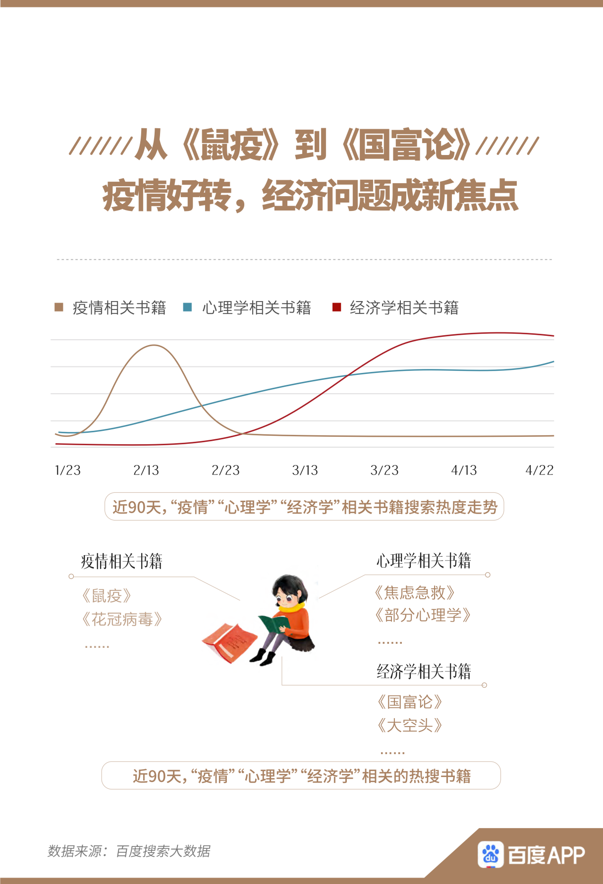 與此同時(shí),疫情變化也影響著人們的閱讀“口味”。報(bào)告顯示,在疫情暴發(fā)之初,與“疫情”相關(guān)書籍的搜索熱度迅速上升,《鼠疫》、《花冠病毒》等具有疫情背景的書籍成為熱搜。隨著國(guó)內(nèi)疫情好轉(zhuǎn),疫情對(duì)心理、經(jīng)濟(jì)的影響逐漸受到人們更多關(guān)注,《焦慮急救》、《國(guó)富論》等“心理學(xué)”、“經(jīng)濟(jì)學(xué)”相關(guān)書籍的搜索熱度均在3月上漲。