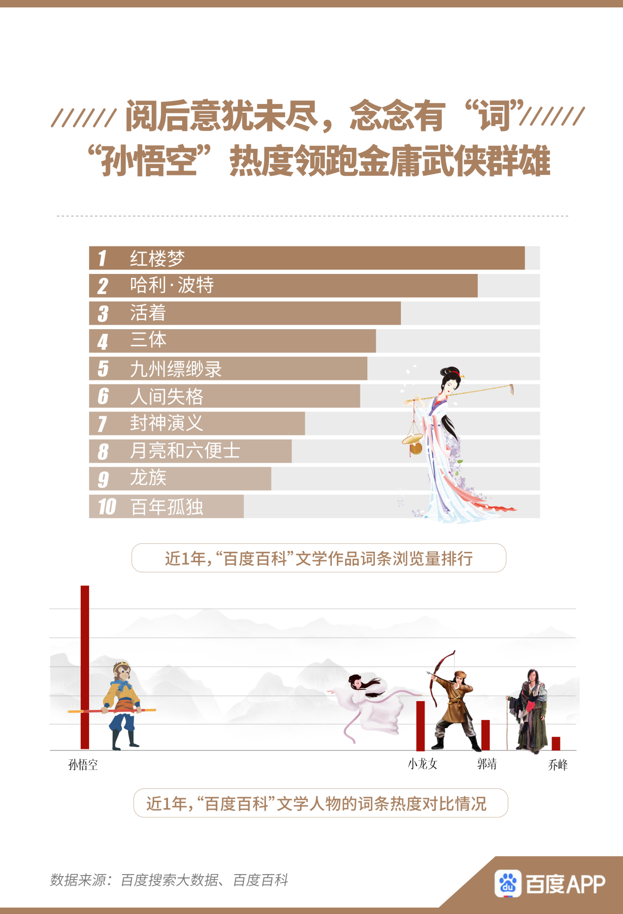 而百度百科的數(shù)據(jù)表明,人們?cè)陂喿x經(jīng)典書籍后,點(diǎn)擊詞條查看更多背景、釋義也是常態(tài)?!都t樓夢(mèng)》、《哈利·波特》、《活著》、《三體》是近1年來(lái)網(wǎng)友在百度百科瀏覽較多的文學(xué)作品相關(guān)詞條。