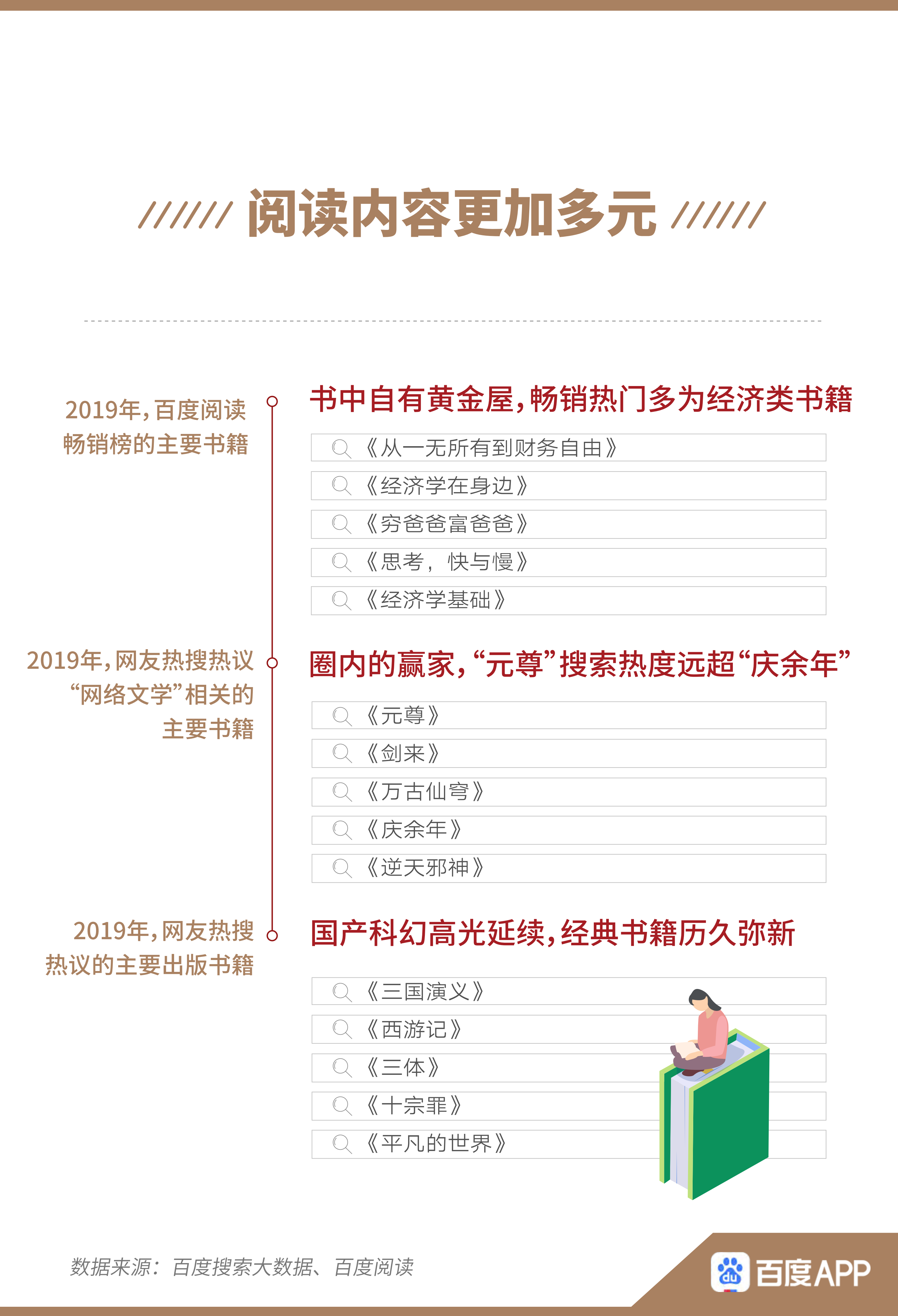 閱讀既有不同地域、年齡、性別等產(chǎn)生的差異,也有明顯的興趣趨勢(shì)。報(bào)告指出,百度閱讀2019年暢銷熱門多為經(jīng)濟(jì)類書籍,人們學(xué)習(xí)理財(cái)投資的意識(shí)增強(qiáng)?!熬W(wǎng)絡(luò)文學(xué)”體現(xiàn)出強(qiáng)大的“圈層”能量,即便已破圈的《慶余年》,其搜索熱度依舊不敵《元尊》。而在網(wǎng)友熱搜熱議的主要出版書籍中,《三國(guó)演義》、《西游記》等經(jīng)典書籍歷久彌新,位居前列。