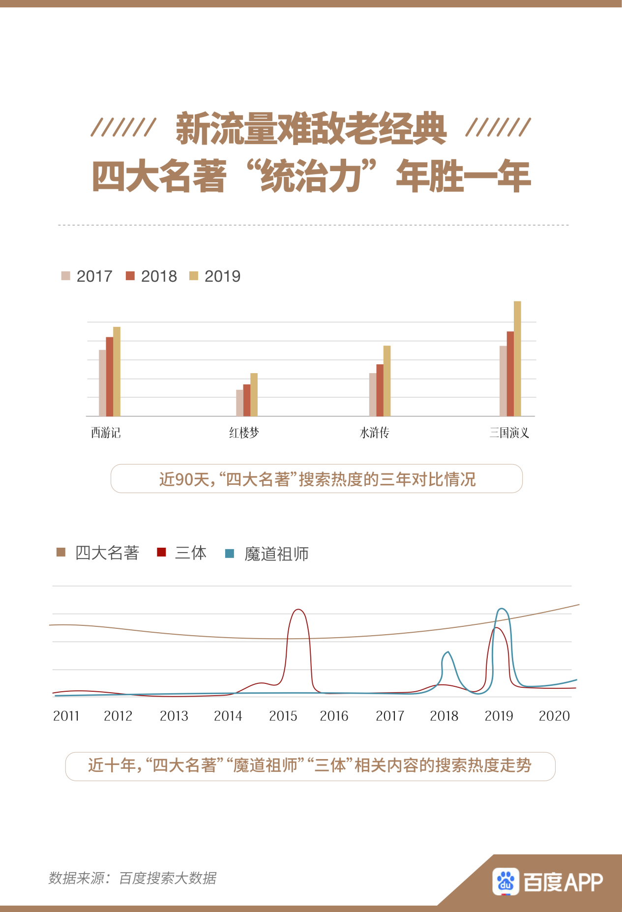 報(bào)告指出,近90天,“四大名著”搜索熱度的三年對(duì)比情況呈現(xiàn)出年年上升的趨勢(shì),對(duì)比如《三體》、《魔道祖師》等近年的熱門書籍,四大名著搜索熱度走勢(shì)更加穩(wěn)定向上,體現(xiàn)出強(qiáng)大的“統(tǒng)治力”。