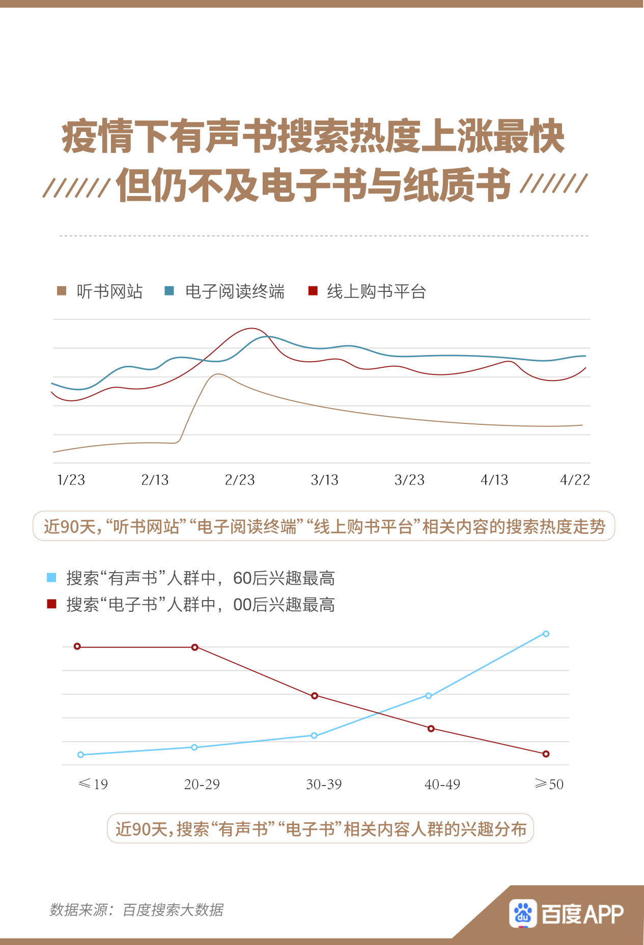 此外,在閱讀方式上,不同年齡也出現(xiàn)不同的偏好。疫情之下,“聽書網(wǎng)站”相關(guān)內(nèi)容的搜索熱度上漲趨勢(shì)明顯,但未能超越“電子閱讀終端”、“線上購(gòu)書平臺(tái)”。在搜索“有聲書”人群中,60后的興趣最高,00后則更能接受“電子書”。