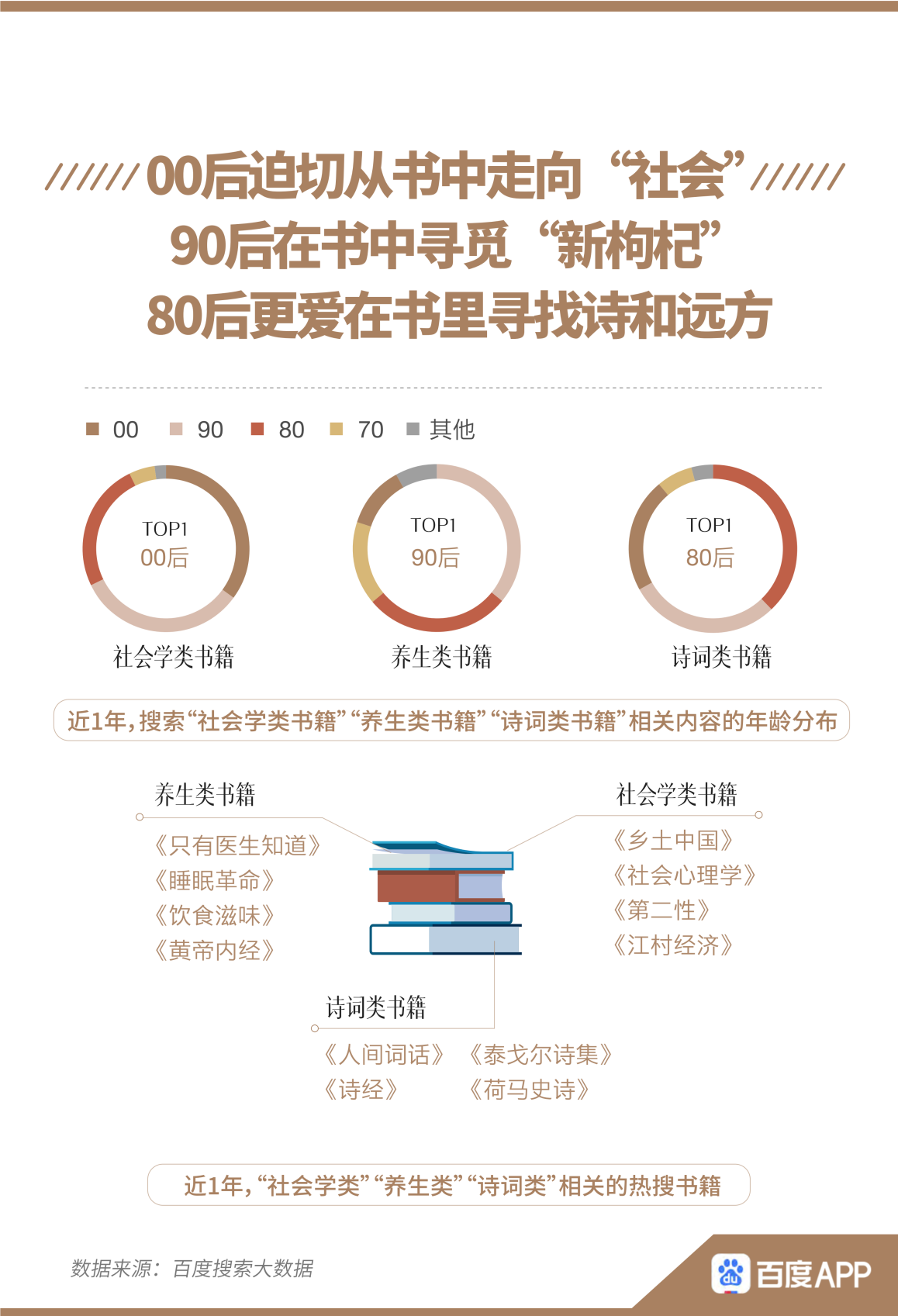 已經(jīng)步入而立之年的90后,開始關(guān)注“精神養(yǎng)生”。邊熬夜,邊閱讀《睡眠革命》、《只有醫(yī)生知道》等養(yǎng)生類書籍是他們的生活常態(tài)。而該養(yǎng)生的中年人不僅是閱讀小說(shuō)的主力軍,也是搜索“詩(shī)詞書籍”最多的人群。