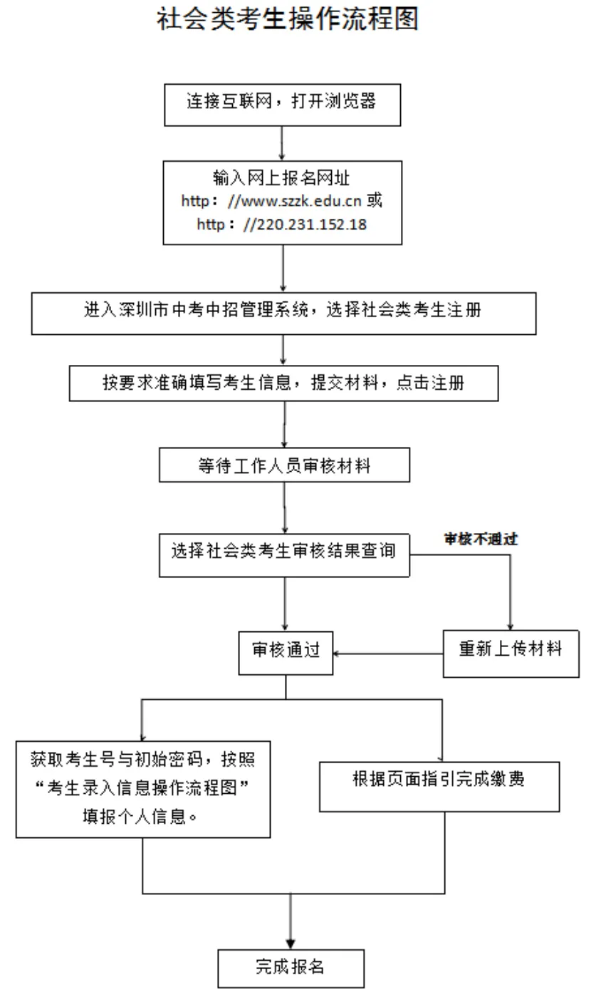 見圳客戶端·深圳新聞網(wǎng)2020年4月30日訊 據(jù)深圳市教育局消息,2020年深圳高中階段學(xué)校招生考試(以下簡(jiǎn)稱“中考”)報(bào)名定于5月6日-15日進(jìn)行,考試時(shí)間為7月20日-21日。 今年本市應(yīng)屆初中畢業(yè)生仍繼續(xù)在就讀學(xué)校集體辦理報(bào)名手續(xù)。符合深圳中考報(bào)名條件的深圳戶籍往屆生、在市外就讀的深圳戶籍應(yīng)屆初中畢業(yè)生(以下簡(jiǎn)稱“社會(huì)類考生”)采用網(wǎng)上報(bào)名方式進(jìn)行報(bào)名。 報(bào)名條件 一、具有我市戶籍的初中畢業(yè)生,可以在我市報(bào)名參加中考。 二、具有我市初三學(xué)籍的隨遷子女可以報(bào)名參加中考,同時(shí)符合以下條件的,可以參加相應(yīng)的公辦普高、民辦普高和中職學(xué)校的劃線錄取。 (一)父親或母親在我市具有合法穩(wěn)定職業(yè); (二)父親或母親在我市具有合法穩(wěn)定住所; (三)父親或母親持有有效《深圳經(jīng)濟(jì)特區(qū)居住證》; (四)父親或母親在我市繳納基本養(yǎng)老保險(xiǎn)及基本醫(yī)療保險(xiǎn),且至少其中一個(gè)險(xiǎn)種累計(jì)繳費(fèi)滿3年,社保累計(jì)年限計(jì)算截至2020年8月31日; (五)隨遷子女在我市具有3年完整初中學(xué)籍。 不符合上述條件但具有我市初中學(xué)籍的隨遷子女,可以在我市參加中考,但僅限于參加民辦普高補(bǔ)錄或中職學(xué)校注冊(cè)入學(xué)。 三、高中階段學(xué)校在校生不得報(bào)名。 本市應(yīng)屆初中畢業(yè)生報(bào)名辦法 本市應(yīng)屆初中畢業(yè)生于5月6日至7日在就讀學(xué)校集體辦理報(bào)名手續(xù)。 今年中考繼續(xù)實(shí)行網(wǎng)上報(bào)名。要求各學(xué)校開放計(jì)算機(jī)房,為本??忌暇W(wǎng)報(bào)名提供方便。 5月8日至15日,學(xué)校組織考生進(jìn)行電子攝像,學(xué)校和考生分別上網(wǎng)錄入報(bào)名信息,考生錄入信息可參考“考生錄入信息流程圖”進(jìn)行操作。 市教育局強(qiáng)調(diào),學(xué)校不得以任何理由拒絕有本校學(xué)籍的應(yīng)屆畢業(yè)生報(bào)考(參加中職學(xué)校自主招生、注冊(cè)入學(xué)的考生,也須報(bào)名參加中考)。如有違反者,將嚴(yán)肅查處,并追究相關(guān)人員責(zé)任。同時(shí)要求各區(qū)有關(guān)職能部門、各有關(guān)學(xué)校(報(bào)名點(diǎn))要嚴(yán)格審查報(bào)名材料。對(duì)不符合報(bào)名條件、弄虛作假而被錄取的考生,一經(jīng)發(fā)現(xiàn),取消其錄取資格;已經(jīng)到錄取學(xué)校報(bào)到注冊(cè)的,取消其學(xué)籍,并追究相關(guān)人員責(zé)任。 社會(huì)類考生報(bào)名辦法 社會(huì)類考生采用網(wǎng)上報(bào)名方式進(jìn)行報(bào)名。報(bào)名考生需在5月6日至15日登錄報(bào)名網(wǎng)址(http://www.szzk.edu.cn/),按照提示進(jìn)行網(wǎng)上注冊(cè),上傳報(bào)名審核資料,由考生戶籍所在區(qū)社會(huì)報(bào)名點(diǎn)進(jìn)行線上審核,審核通過后系統(tǒng)將生成中考考生號(hào)及初始密碼,考生需用獲取的考號(hào)及密碼登錄中考中招管理系統(tǒng),填寫個(gè)人信息,具體操作可參考“考生錄入信息流程圖”。同時(shí)需在報(bào)名截止前根據(jù)指引完成網(wǎng)上繳費(fèi)。 若考生網(wǎng)上報(bào)名審核不通過,需按照系統(tǒng)的不通過原因提示,重新補(bǔ)充審核資料,如多次上傳資料失敗或?qū)徍瞬煌ㄟ^,考生可撥打戶籍所在區(qū)的社會(huì)報(bào)名點(diǎn)電話進(jìn)行咨詢或電話預(yù)約,按照工作人員指示進(jìn)行操作報(bào)名,不要在未預(yù)約的情況下前往社會(huì)報(bào)名點(diǎn),盡量避免出行,減少人員聚集。 社會(huì)類考生操作流程如下圖: