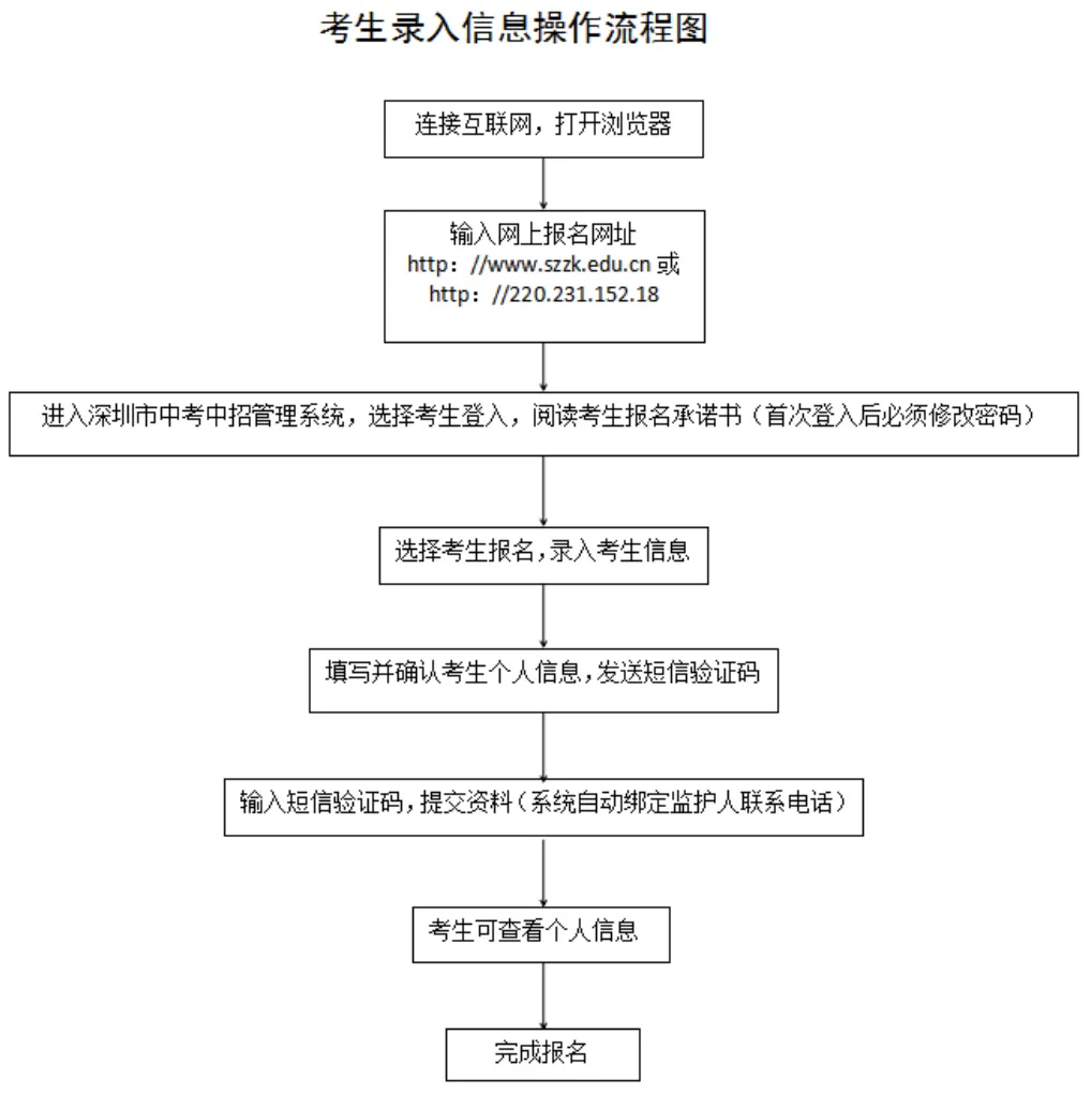 見圳客戶端·深圳新聞網(wǎng)2020年4月30日訊 據(jù)深圳市教育局消息,2020年深圳高中階段學(xué)校招生考試(以下簡(jiǎn)稱“中考”)報(bào)名定于5月6日-15日進(jìn)行,考試時(shí)間為7月20日-21日。 今年本市應(yīng)屆初中畢業(yè)生仍繼續(xù)在就讀學(xué)校集體辦理報(bào)名手續(xù)。符合深圳中考報(bào)名條件的深圳戶籍往屆生、在市外就讀的深圳戶籍應(yīng)屆初中畢業(yè)生(以下簡(jiǎn)稱“社會(huì)類考生”)采用網(wǎng)上報(bào)名方式進(jìn)行報(bào)名。 報(bào)名條件 一、具有我市戶籍的初中畢業(yè)生,可以在我市報(bào)名參加中考。 二、具有我市初三學(xué)籍的隨遷子女可以報(bào)名參加中考,同時(shí)符合以下條件的,可以參加相應(yīng)的公辦普高、民辦普高和中職學(xué)校的劃線錄取。 (一)父親或母親在我市具有合法穩(wěn)定職業(yè); (二)父親或母親在我市具有合法穩(wěn)定住所; (三)父親或母親持有有效《深圳經(jīng)濟(jì)特區(qū)居住證》; (四)父親或母親在我市繳納基本養(yǎng)老保險(xiǎn)及基本醫(yī)療保險(xiǎn),且至少其中一個(gè)險(xiǎn)種累計(jì)繳費(fèi)滿3年,社保累計(jì)年限計(jì)算截至2020年8月31日; (五)隨遷子女在我市具有3年完整初中學(xué)籍。 不符合上述條件但具有我市初中學(xué)籍的隨遷子女,可以在我市參加中考,但僅限于參加民辦普高補(bǔ)錄或中職學(xué)校注冊(cè)入學(xué)。 三、高中階段學(xué)校在校生不得報(bào)名。 本市應(yīng)屆初中畢業(yè)生報(bào)名辦法 本市應(yīng)屆初中畢業(yè)生于5月6日至7日在就讀學(xué)校集體辦理報(bào)名手續(xù)。 今年中考繼續(xù)實(shí)行網(wǎng)上報(bào)名。要求各學(xué)校開放計(jì)算機(jī)房,為本??忌暇W(wǎng)報(bào)名提供方便。 5月8日至15日,學(xué)校組織考生進(jìn)行電子攝像,學(xué)校和考生分別上網(wǎng)錄入報(bào)名信息,考生錄入信息可參考“考生錄入信息流程圖”進(jìn)行操作。 市教育局強(qiáng)調(diào),學(xué)校不得以任何理由拒絕有本校學(xué)籍的應(yīng)屆畢業(yè)生報(bào)考(參加中職學(xué)校自主招生、注冊(cè)入學(xué)的考生,也須報(bào)名參加中考)。如有違反者,將嚴(yán)肅查處,并追究相關(guān)人員責(zé)任。同時(shí)要求各區(qū)有關(guān)職能部門、各有關(guān)學(xué)校(報(bào)名點(diǎn))要嚴(yán)格審查報(bào)名材料。對(duì)不符合報(bào)名條件、弄虛作假而被錄取的考生,一經(jīng)發(fā)現(xiàn),取消其錄取資格;已經(jīng)到錄取學(xué)校報(bào)到注冊(cè)的,取消其學(xué)籍,并追究相關(guān)人員責(zé)任。 社會(huì)類考生報(bào)名辦法 社會(huì)類考生采用網(wǎng)上報(bào)名方式進(jìn)行報(bào)名。報(bào)名考生需在5月6日至15日登錄報(bào)名網(wǎng)址(http://www.szzk.edu.cn/),按照提示進(jìn)行網(wǎng)上注冊(cè),上傳報(bào)名審核資料,由考生戶籍所在區(qū)社會(huì)報(bào)名點(diǎn)進(jìn)行線上審核,審核通過(guò)后系統(tǒng)將生成中考考生號(hào)及初始密碼,考生需用獲取的考號(hào)及密碼登錄中考中招管理系統(tǒng),填寫個(gè)人信息,具體操作可參考“考生錄入信息流程圖”。同時(shí)需在報(bào)名截止前根據(jù)指引完成網(wǎng)上繳費(fèi)。 若考生網(wǎng)上報(bào)名審核不通過(guò),需按照系統(tǒng)的不通過(guò)原因提示,重新補(bǔ)充審核資料,如多次上傳資料失敗或?qū)徍瞬煌ㄟ^(guò),考生可撥打戶籍所在區(qū)的社會(huì)報(bào)名點(diǎn)電話進(jìn)行咨詢或電話預(yù)約,按照工作人員指示進(jìn)行操作報(bào)名,不要在未預(yù)約的情況下前往社會(huì)報(bào)名點(diǎn),盡量避免出行,減少人員聚集。 社會(huì)類考生操作流程如下圖: 考生錄入信息操作流程如下圖: 中考社會(huì)報(bào)名點(diǎn)一覽表 深圳各類考生具體報(bào)考范圍、各類升學(xué)資格申報(bào)所需條件和材料以及相關(guān)報(bào)名要求,考生可通過(guò)深圳市招生考試辦公室官網(wǎng)(zkb.sz.gov.cn)及官方微信公眾號(hào)(深圳市招生考試辦公室)查閱,市招考辦也將第一時(shí)間通過(guò)上述渠道發(fā)布各類中考資訊。