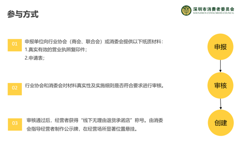 申請(qǐng)通過后,經(jīng)營者即可獲得“線下無理由退貨承諾店”稱號(hào),具體參與方式見下圖。