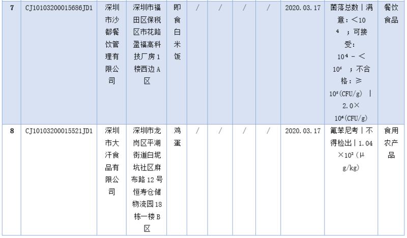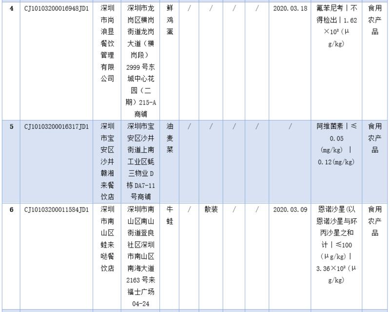 見(jiàn)圳客戶端·深圳新聞網(wǎng)2020年5月1日訊(深圳特區(qū)報(bào)記者 楊德琦)4月30日,深圳市市場(chǎng)監(jiān)督管理局發(fā)布第十四期食品安全抽樣檢驗(yàn)情況通報(bào),3月共抽檢餐飲環(huán)節(jié)食品1009批次,涉及餐飲環(huán)節(jié)經(jīng)營(yíng)主體919家次,共檢測(cè)食品指標(biāo)6347項(xiàng)次。其中不合格樣品8批次,涉及不合格食品類別有食用農(nóng)產(chǎn)品6批次,黃豆芽、蘿卜、雞蛋、油麥菜、牛蛙等在列;餐飲食品1批次,為即食白米飯;食用油、油脂及其制品1批次,為煎炸用油。涉及不合格項(xiàng)目類別為獸藥殘留、農(nóng)藥殘留、非食用物質(zhì)、微生物污染、品質(zhì)指標(biāo)。