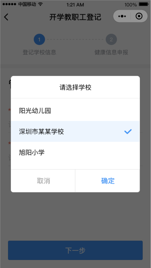 ②點擊“馬上登記”按鈕,填寫學校管理員姓名和手機號碼(學校管理員姓名和手機號碼請詢問學校獲得)后點擊“下一步”,然后選擇對應(yīng)的學校。