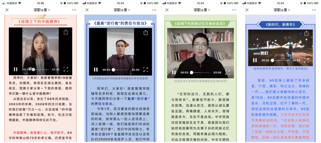 深圳職業(yè)技術(shù)學(xué)院學(xué)生工作部組織33位青年輔導(dǎo)員,推出33講戰(zhàn)“疫情”系列微課程,每天8:30準(zhǔn)時推送。微課程主題涵蓋愛國主義教育、理想信念教育、生命教育、社會責(zé)任感教育、感恩教育,不同的主題、不同的視頻、不同的感悟,輔導(dǎo)員老師和同學(xué)們一起在戰(zhàn)“疫”中成長,為同學(xué)們講述每一個戰(zhàn)“疫”的感人故事。建環(huán)學(xué)院輔導(dǎo)員薛菲菲老師制作精美短視頻、撰寫文案、配樂、配音,以有思想又有溫度的方式與學(xué)生對話。她說,磨煉是成長的催化劑,抗疫是時代給予的成人禮,經(jīng)此一役,中國的年輕人們對責(zé)任和奉獻的感受更加直觀,對勇敢和擔(dān)當(dāng)?shù)睦斫飧由羁?,而中國,也因?0后,收獲了青春洋溢的蓬勃力量!
