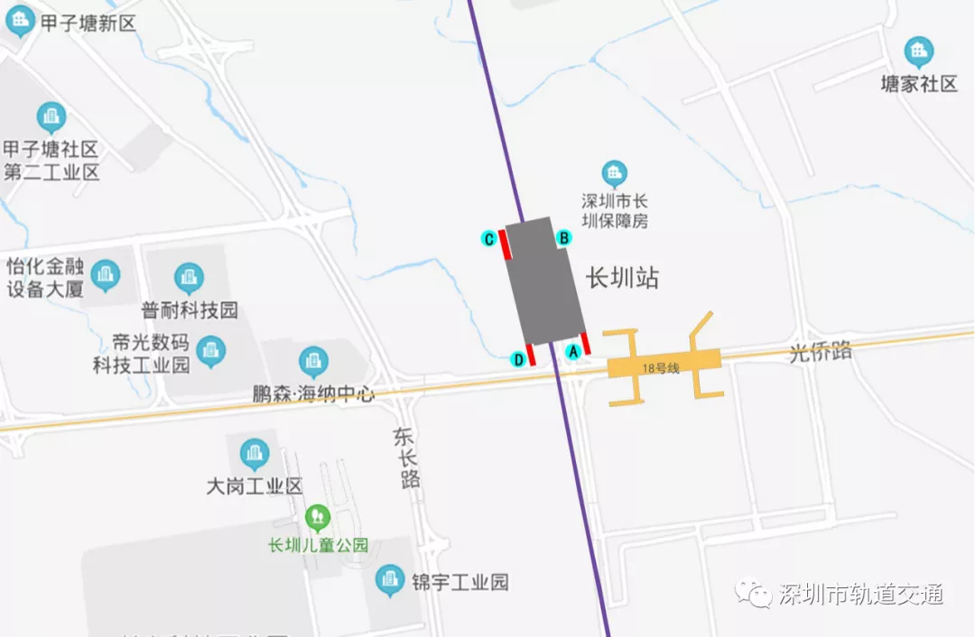 長圳站位于科裕路與光僑大道交叉路口以北,沿科裕路路中呈南北向布置,車站為地上三層側(cè)式站臺鋼筋混凝土框架結(jié)構(gòu)。其中,車站出入口共計4個:A出入口、B出入口、C出入口、D出入口。
