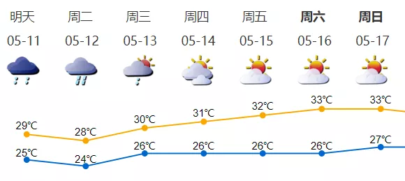 5月11日陰天,氣溫25-29℃,有陣雨或雷陣雨,伴有短時陣風7級左右。12日有雷陣雨,局部大雨,局部有短時強降雨;13日陣雨轉(zhuǎn)多云;14-17日多云到晴天,天氣再趨悶熱。