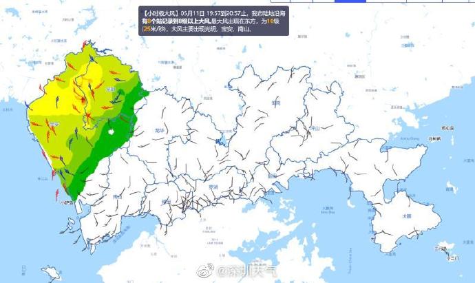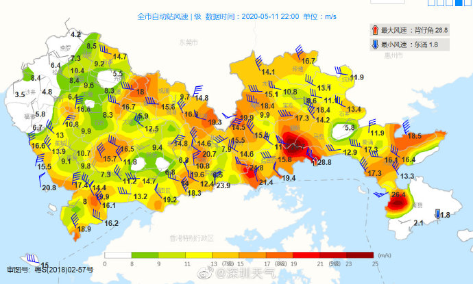 22時(shí)18分:過去1小時(shí)深圳市最大陣風(fēng)達(dá)到10-11級(jí),出現(xiàn)在鹽田和大鵬南澳地區(qū)。