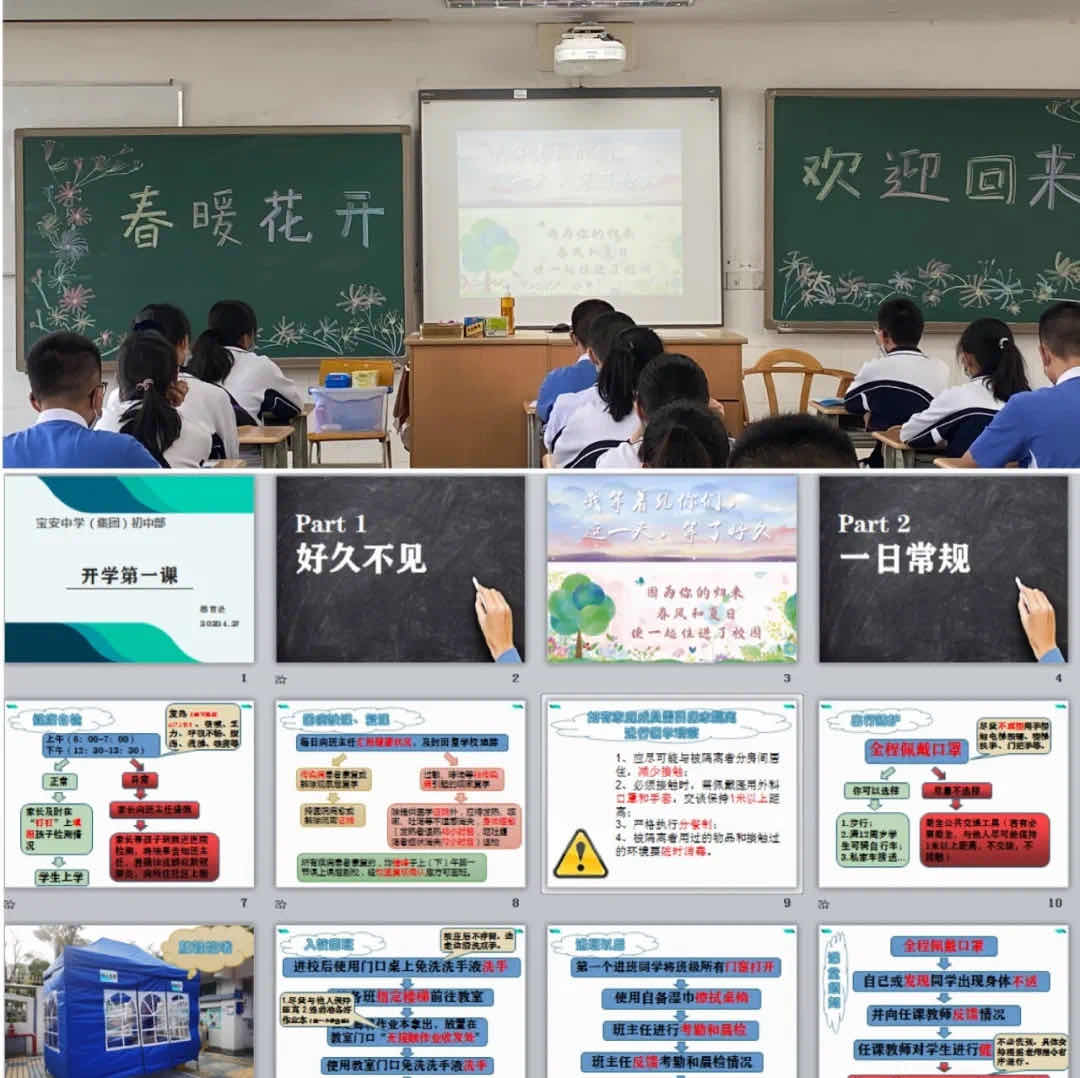 學(xué)校在校門外設(shè)立進入通道,讓學(xué)生按照提前設(shè)置好的路線指引, 分批分流 進入校園。學(xué)校課室的課桌擺放呈“一人一桌”制,樓道貼上站位地標(biāo),充分拉開學(xué)生安全間距離, 少交談少聚集 。除此之外,學(xué)校通過取消課間操、眼操等方式壓縮課間,實現(xiàn) 錯峰放學(xué) 。各班門前設(shè)置無接觸交作業(yè)區(qū),放置免洗洗手液,另外還特地為學(xué)生發(fā)放常規(guī)指引小冊子,制作了《寶安中學(xué)(集團)2020年春季學(xué)期返校復(fù)學(xué)指引》手繪視頻,開設(shè)了以防疫為主要內(nèi)容的“開學(xué)第一課”,讓防疫知識 入耳入腦入心 。