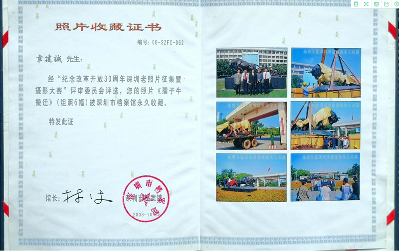 “一開始,我提出這個遷移建議時,還是有點忐忑的,后來得知‘孺子?!袼軐⒁浦潦形笤和夂?,我非常高興,這樣一來,跟‘孺子?!嫌熬头奖愣嗔搜剑 薄叭孀优!钡袼苓w移當(dāng)天,韋建誠興奮地拿起相機,用鏡頭定格下整個搬遷過程。“那一天是我人生最難忘的日子之一,既是我44歲生日,又是‘孺子?!袼馨残录抑??!被貞浧甬?dāng)時的情況,韋建誠還是十分興奮。而韋建誠拍攝的組照后來被深圳市檔案館永久收藏。深圳市委辦公廳還將《市民希望將“孺子牛”雕塑移至市府大院外》評為一等獎。