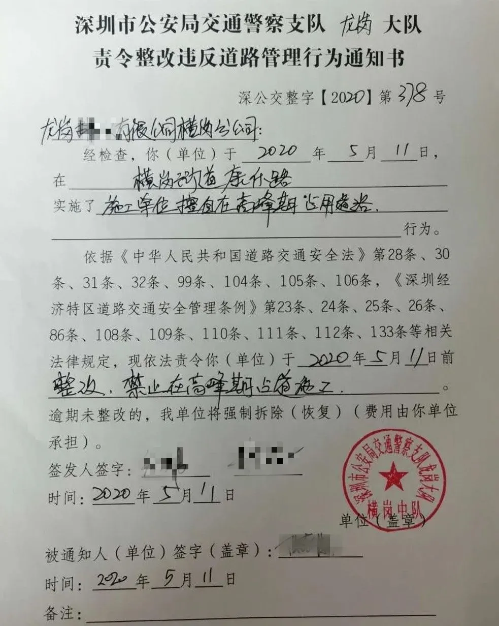 龍崗**有限公司橫崗分公司擅自在高峰期占用道路施工,執(zhí)勤民警責(zé)令立即整改、撤離現(xiàn)場。